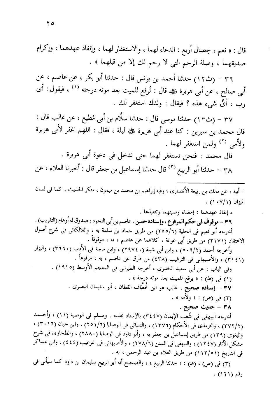 38- حَدثنا أَبُو الرَّبِيعِ، قَالَ: حَدثنا إِسْمَاعِيلُ بْنُ جَعْفَرٍ، قَالَ: أَخْبَرَنَا الْعَلاَءُ، عَنْ أَبِيهِ، عَنْ أَبِي هُرَيْرَةَ، أَنَّ رَسُولَ اللهِ صَلى الله عَلَيهِ وسَلم قَالَ: إِذَا مَاتَ الْعَبْدُ انْقَطَعَ عَنْهُ عَمَلُهُ إِلاَّ مِنْ ثَلاَثٍ: صَدَقَةٍ جَارِيَةٍ، أَوْ عِلْمٍ يُنْتَفَعُ بِهِ، أَوْ وَلَدٍ صَالِحٍ يَدْعُو لَهُ.