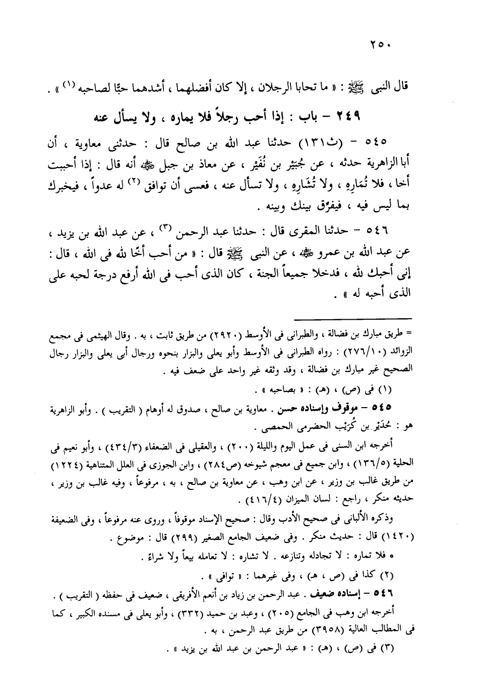 545- حَدثنا عَبْدُ اللهِ بْنُ صَالِحٍ قَالَ: حَدَّثَنِي مُعَاوِيَةُ، أَنَّ أَبَا الزَّاهِرِيَّةِ حَدَّثَهُ، عَنْ جُبَيْرِ بْنِ نُفَيْرٍ، عَنْ مُعَاذِ بْنِ جَبَلٍ أَنَّهُ قَالَ: إِذَا أَحْبَبْتَ أَخًا فَلاَ تُمَارِهِ، وَلاَ تُشَارِّهِ، وَلاَ تَسْأَلْ عَنْهُ، فَعَسَى أَنْ تُوَافِيَ لَهُ عَدُوًّا فَيُخْبِرَكَ بِمَا لَيْسَ فِيهِ، فَيُفَرِّقَ بَيْنَكَ وَبَيْنَهُ.