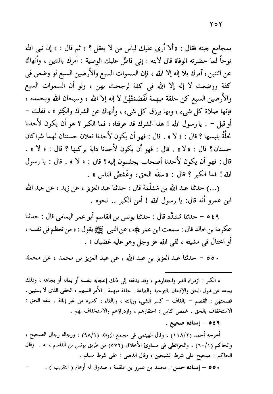 549- حَدثنا مُسَدَّدٌ، قَالَ: حَدثنا يُونُسُ بْنُ الْقَاسِمِ أَبُو عُمَرَ الْيَمَامِيُّ، قَالَ: حَدثنا عِكْرِمَةُ بْنُ خَالِدٍ قَالَ: سَمِعْتُ ابْنَ عُمَرَ، عَنِ النَّبِيِّ صَلى الله عَلَيهِ وسَلم يَقُولُ: مَنْ تَعَظَّمَ فِي نَفْسِهِ، أَوِ اخْتَالَ فِي مِشْيَتِهِ، لَقِيَ اللهَ عَزَّ وَجَلَّ وَهُوَ عَلَيْهِ غَضْبَانُ.