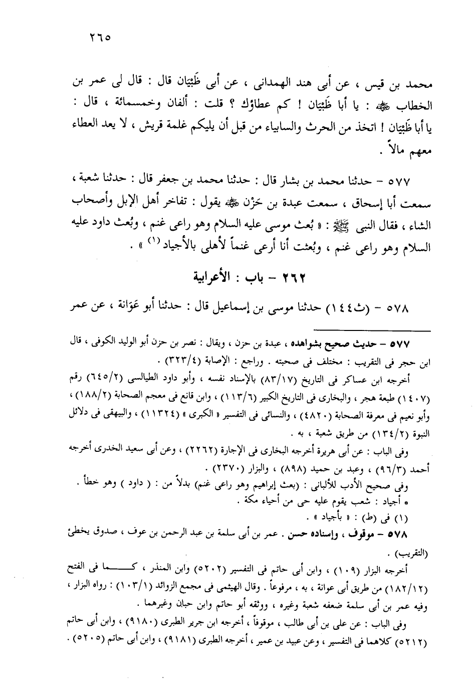 577- حَدثنا مُحَمَّدُ بْنُ بَشَّارٍ، قَالَ: حَدثنا مُحَمَّدُ بْنُ جَعْفَرٍ، قَالَ: حَدثنا شُعْبَةُ، سَمِعْتُ أَبَا إِسْحَاقَ، سَمِعْتُ عَبْدَةَ بْنَ حَزْنٍ يَقُولُ: تَفَاخَرَ أَهْلُ الإِبِلِ وَأَصْحَابُ الشَّاءِ، فَقَالَ النَّبِيُّ صَلى الله عَلَيهِ وسَلم: بُعِثَ مُوسَى وَهُوَ رَاعِي غَنَمٍ، وَبُعِثَ دَاوُدُ وَهُوَ رَاعٍ، وَبُعِثْتُ أَنَا وَأَنَا أَرْعَى غَنَمًا لأَهْلِي بِأَجْيَادِ.