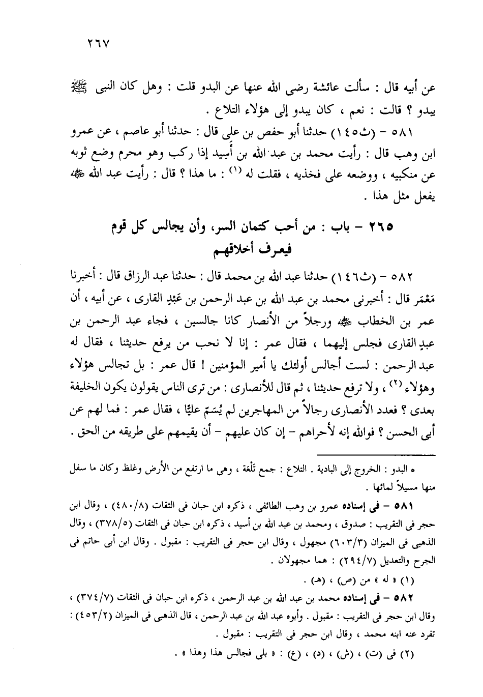 582- حَدثنا عَبْدُ اللهِ بْنُ مُحَمَّدٍ، قَالَ: حَدثنا عَبْدُ الرَّزَّاقِ، قَالَ: أَخْبَرَنَا مَعْمَرٌ قَالَ: أَخْبَرَنِي مُحَمَّدُ بْنُ عَبْدِ اللهِ بْنِ عَبْدِ الرَّحْمَنِ بْنِ عَبْدٍ الْقَارِيِّ، عَنْ أَبِيهِ، أَنَّ عُمَرَ بْنَ الْخَطَّابِ وَرَجُلاً مِنَ الأَنْصَارِ كَانَا جَالِسَيْنِ، فَجَاءَ عَبْدُ الرَّحْمَنِ بْنُ عَبْدِ الْقَارِيِّ فَجَلَسَ إِلَيْهِمَا، فَقَالَ عُمَرُ: إِنَّا لاَ نُحِبُّ مَنْ يَرْفَعُ حَدِيثَنَا، فَقَالَ لَهُ عَبْدُ الرَّحْمَنِ: لَسْتُ أُجَالِسُ أُولَئِكَ يَا أَمِيرَ الْمُؤْمِنِينَ، قَالَ عُمَرُ: بَلَى، فَجَالِسْ هَذَا وَهَذَا، وَلاَ تَرْفَعْ حَدِيثَنَا، ثُمَّ قَالَ لِلأَنْصَارِيِّ: مَنْ تَرَى النَّاسَ يَقُولُونَ يَكُونُ الْخَلِيفَةَ بَعْدِي؟ فَعَدَّدَ الأَنْصَارِيُّ رِجَالاً مِنَ الْمُهَاجِرِينَ، لَمْ يُسَمِّ عَلِيًّا، فَقَالَ عُمَرُ: فَمَا لَهُمْ عَنْ أَبِي الْحَسَنِ؟ فَوَاللَّهِ إِنَّهُ لَأَحْرَاهُمْ، إِنْ كَانَ عَلَيْهِمْ، أَنْ يُقِيمَهُمْ عَلَى طَرِيقَةٍ مِنَ الْحَقِّ.