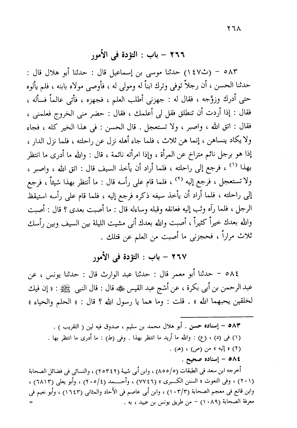 583- حَدثنا مُوسَى بْنُ إِسْمَاعِيلَ، قَالَ: حَدثنا أَبُو هِلاَلٍ، قَالَ: حَدثنا الْحَسَنُ، أَنَّ رَجُلاً تُوُفِّيَ وَتَرَكَ ابْنًا لَهُ وَمَوْلًى لَهُ، فَأَوْصَى مَوْلاَهُ بِابْنِهِ، فَلَمْ يَأْلُوهُ حَتَّى أَدْرَكَ وَزَوَّجَهُ، فَقَالَ لَهُ: جَهَّزْنِي أَطْلُبِ الْعِلْمَ، فَجَهَّزَهُ، فَأَتَى عَالِمًا فَسَأَلَهُ، فَقَالَ: إِذَا أَرَدْتَ أَنْ تَنْطَلِقَ فَقُلْ لِي أُعَلِّمْكَ، فَقَالَ: حَضَرَ مِنِّي الْخُرُوجُ فَعَلِّمْنِي، فَقَالَ: اتَّقِ اللهَ وَاصْبِرْ، وَلاَ تَسْتَعْجِلْ، قَالَ الْحَسَنُ: فِي هَذَا الْخَيْرُ كُلُّهُ، فَجَاءَ وَلاَ يَكَادُ يَنْسَاهُنَّ، إِنَّمَا هُنَّ ثَلاَثٌ، فَلَمَّا جَاءَ أَهْلَهُ نَزَلَ عَنْ رَاحِلَتِهِ، فَلَمَّا نَزَلَ الدَّارَ إِذَا هُوَ بِرَجُلٍ نَائِمٍ مُتَرَاخٍ عَنِ الْمَرْأَةِ، وَإِذَا امْرَأَتُهُ نَائِمَةٌ، قَالَ: وَاللَّهِ مَا أُرِيدُ مَا أَنْتَظِرُ بِهَذَا؟ فَرَجَعَ إِلَى رَاحِلَتِهِ، فَلَمَّا أَرَادَ أَنْ يَأْخُذَ السَّيْفَ قَالَ: اتَّقِ اللهَ وَاصْبِرْ، وَلاَ تَسْتَعْجِلْ، فَرَجَعَ، فَلَمَّا قَامَ عَلَى رَأْسِهِ قَالَ: مَا أَنْتَظِرُ بِهَذَا شَيْئًا، فَرَجَعَ إِلَى رَاحِلَتِهِ، فَلَمَّا أَرَادَ أَنْ يَأْخُذَ سَيْفَهُ ذَكَرَهُ، فَرَجَعَ إِلَيْهِ، فَلَمَّا قَامَ عَلَى رَأْسِهِ اسْتَيْقَظَ الرَّجُلُ، فَلَمَّا رَآهُ وَثَبَ إِلَيْهِ فَعَانَقَهُ وَقَبَّلَهُ، وَسَاءَلَهُ قَالَ: مَا أَصَبْتَ بَعْدِي؟ قَالَ: أَصَبْتُ وَاللَّهِ بَعْدَكَ خَيْرًا كَثِيرًا، أَصَبْتُ وَاللَّهِ بَعْدَكَ: أَنِّي مَشَيْتُ اللَّيْلَةَ بَيْنَ السَّيْفِ وَبَيْنَ رَأْسِكَ ثَلاَثَ مِرَارٍ، فَحَجَزَنِي مَا أَصَبْتُ مِنَ الْعِلْمِ عَنْ قَتْلِكَ.