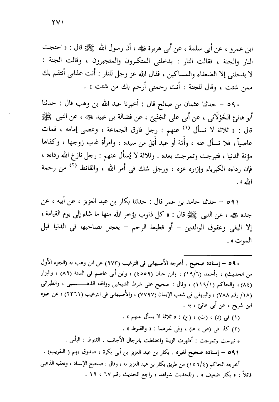 590- حَدثنا عُثْمَانُ بْنُ صَالِحٍ، قَالَ: أَخْبَرَنَا عَبْدُ اللهِ بْنُ وَهْبٍ، قَالَ: حَدثنا أَبُو هَانِئٍ الْخَوْلاَنِيُّ، عَنْ أَبِي عَلِيٍّ الْجَنْبِيِّ، عَنْ فَضَالَةَ بْنِ عُبَيْدٍ، عَنِ النَّبِيِّ صَلى الله عَلَيهِ وسَلم قَالَ: ثَلاَثَةٌ لاَ يُسْأَلُ عَنْهُمْ: رَجُلٌ فَارَقَ الْجَمَاعَةَ وَعَصَى إِمَامَهُ فَمَاتَ عَاصِيًا، فَلاَ تَسْأَلْ عَنْهُ، وَأَمَةٌ أَوْ عَبْدٌ أَبِقَ مِنْ سَيِّدِهِ، وَامْرَأَةٌ غَابَ زَوْجُهَا، وَكَفَاهَا مَؤُونَةَ الدُّنْيَا فَتَبَرَّجَتْ وَتَمَرَّجَتْ بَعْدَهُ، وَثَلاَثَةٌ لاَ يُسْأَلُ عَنْهُمْ: رَجُلٌ نَازَعَ اللهَ رِدَاءَهُ، فَإِنَّ رِدَاءَهُ الْكِبْرِيَاءُ، وَإِزَارَهُ عِزَّهُ، وَرَجُلٌ شَكَّ فِي أَمْرِ اللهِ، وَالْقُنُوطُ مِنْ رَحْمَةِ اللهِ.