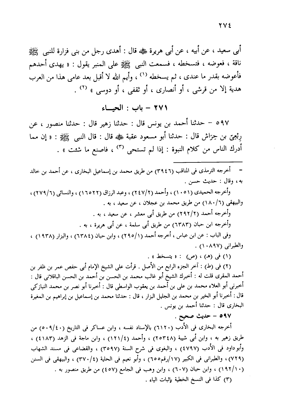 597- حَدثنا أَحْمَدُ بْنُ يُونُسَ، قَالَ: حَدثنا زُهَيْرٌ، قَالَ: حَدثنا مَنْصُورٌ، عَنْ رِبْعِيِّ بْنِ حِرَاشٍ، قَالَ: حَدثنا أَبُو مَسْعُودٍ عُقْبَةُ قَالَ: قَالَ النَّبِيُّ صَلى الله عَلَيهِ وسَلم: إِنَّ مِمَّا أَدْرَكَ النَّاسَ مِنْ كَلاَمِ النُّبُوَّةِ: إِذَا لَمْ تَسْتَحِ فَاصْنَعْ مَا شِئْتَ.