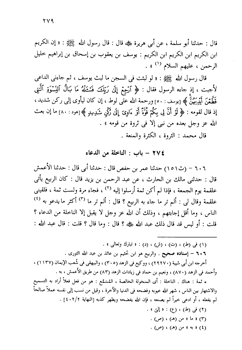 606- حَدثنا عُمَرُ بْنُ حَفْصٍ، قَالَ: حَدثنا أَبِي، قَالَ: حَدثنا الأَعْمَشُ قَالَ: حَدَّثَنِي مَالِكُ بْنُ الْحَارِثِ، عَنْ عَبْدِ الرَّحْمَنِ بْنِ يَزِيدَ قَالَ: كَانَ الرَّبِيعُ يَأْتِي عَلْقَمَةَ يَوْمَ الْجُمُعَةِ، فَإِذَا لَمْ أَكُنْ ثَمَّةَ أَرْسَلُوا إِلَيَّ، فَجَاءَ مَرَّةً وَلَسْتُ ثَمَّةَ، فَلَقِيَنِي عَلْقَمَةُ وَقَالَ لِي: أَلَمْ تَرَ مَا جَاءَ بِهِ الرَّبِيعُ؟ قَالَ: أَلَمْ تَرَ أَكْثَرَ مَا يَدْعُو النَّاسَ، وَمَا أَقَلَّ إِجَابَتَهُمْ؟ وَذَلِكَ أَنَّ اللهَ عَزَّ وَجَلَّ لاَ يَقْبَلُ إِلاَّ النَّاخِلَةَ مِنَ الدُّعَاءِ، قُلْتُ: أَوَ لَيْسَ قَدْ قَالَ ذَلِكَ عَبْدُ اللهِ؟ قَالَ: وَمَا قَالَ؟ قَالَ: قَالَ عَبْدُ اللهِ: لاَ يَسْمَعُ اللهُ مِنْ مُسْمِعٍ، وَلاَ مُرَاءٍ، وَلا لاعِبٍ، إِلا دَاعٍ دَعَا يَثْبُتُ مِنْ قَلْبِهِ، قَالَ: فَذَكَرَ عَلْقَمَةَ؟ قَالَ: نَعَمْ.