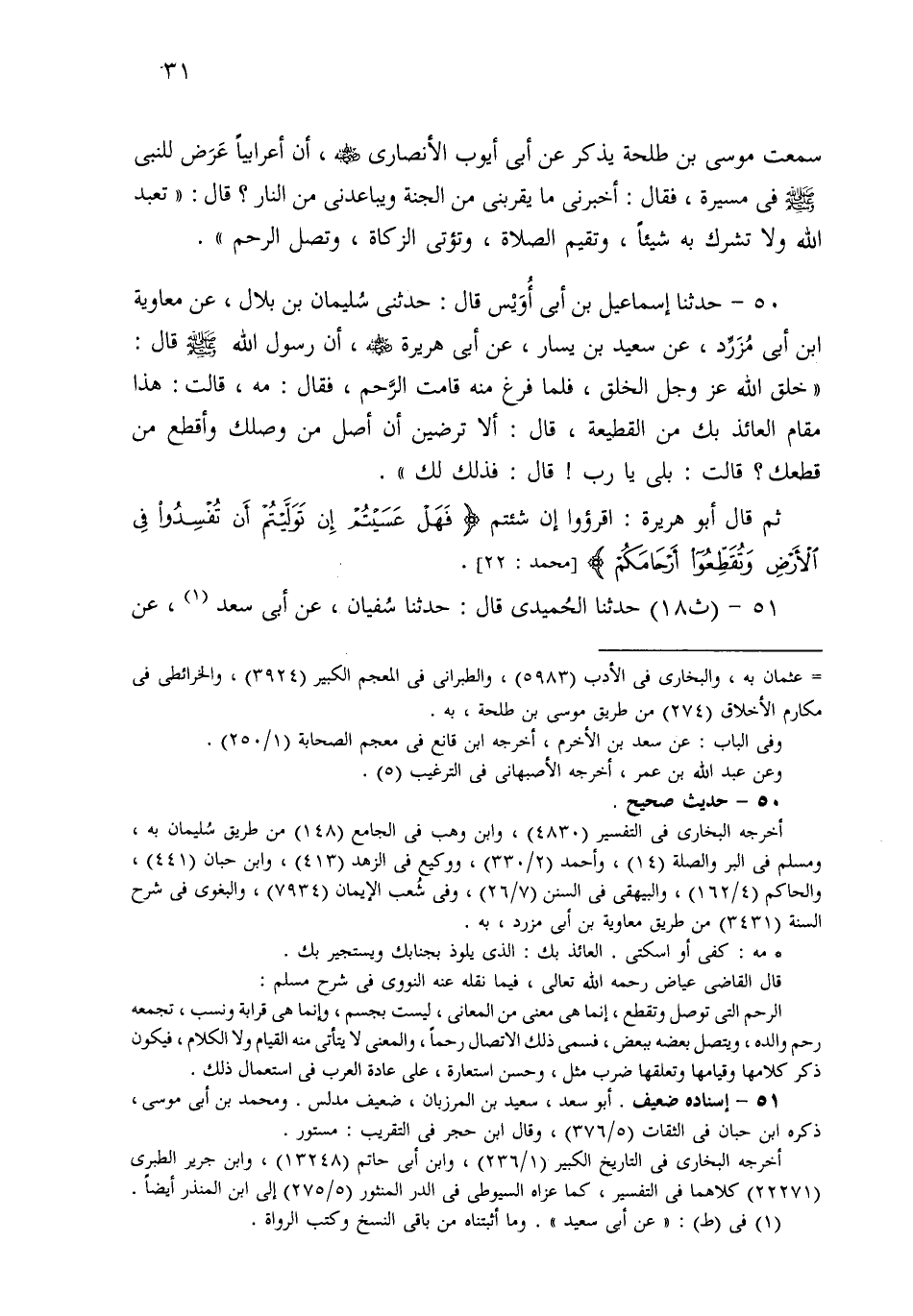 50- حَدثنا إِسْمَاعِيلُ بْنُ أَبِي أُوَيْسٍ قَالَ: حَدَّثَنِي سُلَيْمَانُ بْنُ بِلاَلٍ، عَنْ مُعَاوِيَةَ بْنِ أَبِي مُزَرِّدٍ، عَنْ سَعِيدِ بْنِ يَسَارٍ، عَنْ أَبِي هُرَيْرَةَ، أَنَّ رَسُولَ اللهِ صَلى الله عَلَيهِ وسَلم قَالَ: خَلَقَ اللهُ عَزَّ وَجَلَّ الْخَلْقَ، فَلَمَّا فَرَغَ مِنْهُ قَامَتِ الرَّحِمُ، فَقَالَ: مَهْ، قَالَتْ: هَذَا مَقَامُ الْعَائِذِ بِكَ مِنَ الْقَطِيعَةِ، قَالَ: أَلاَ تَرْضَيْنَ أَنْ أَصِلَ مَنْ وَصَلَكِ، وَأَقْطَعَ مَنْ قَطَعَكِ؟ قَالَتْ: بَلَى يَا رَبِّ، قَالَ: فَذَلِكَ لَكِ ثُمَّ قَالَ أَبُو هُرَيْرَةَ: اقْرَؤُوا إِنْ شِئْتُمْ: {فَهَلْ عَسَيْتُمْ إِنْ تَوَلَّيْتُمْ أَنْ تُفْسِدُوا فِي الأَرْضِ وَتُقَطِّعُوا أَرْحَامَكُمْ}.