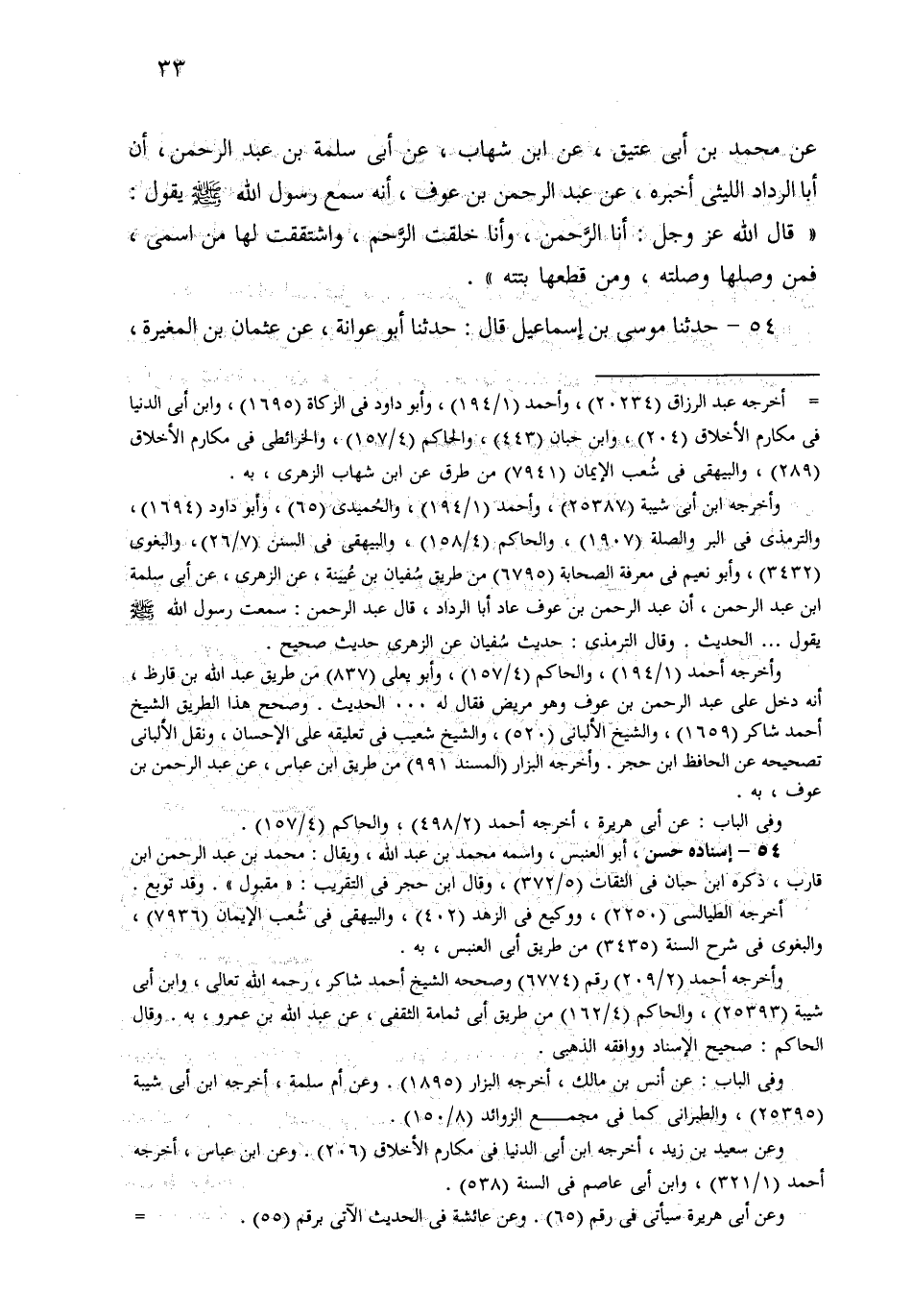 54- حَدثنا مُوسَى بْنُ إِسْمَاعِيلَ، قَالَ: حَدثنا أَبُو عَوَانَةَ، عَنْ عُثْمَانَ بْنِ الْمُغِيرَةِ، عَنْ أَبِي الْعَنْبَسِ قَالَ: دَخَلْتُ عَلَى عَبْدِ اللهِ بْنِ عَمْرٍو فِي الْوَهْطِ يَعْنِي أَرْضًا لَهُ بِالطَّائِفِ، فَقَالَ: عَطَفَ لَنَا النَّبِيُّ صَلى الله عَلَيهِ وسَلم إِصْبَعَهُ فَقَالَ: الرَّحِمُ شُجْنَةٌ مِنَ الرَّحْمَنِ، مَنْ يَصِلْهَا يَصِلْهُ، وَمَنْ يَقْطَعْهَا يَقْطَعْهُ، لَهَا لِسَانٌ طَلْقٌ ذَلْقٌ يَوْمَ الْقِيَامَةِ.
