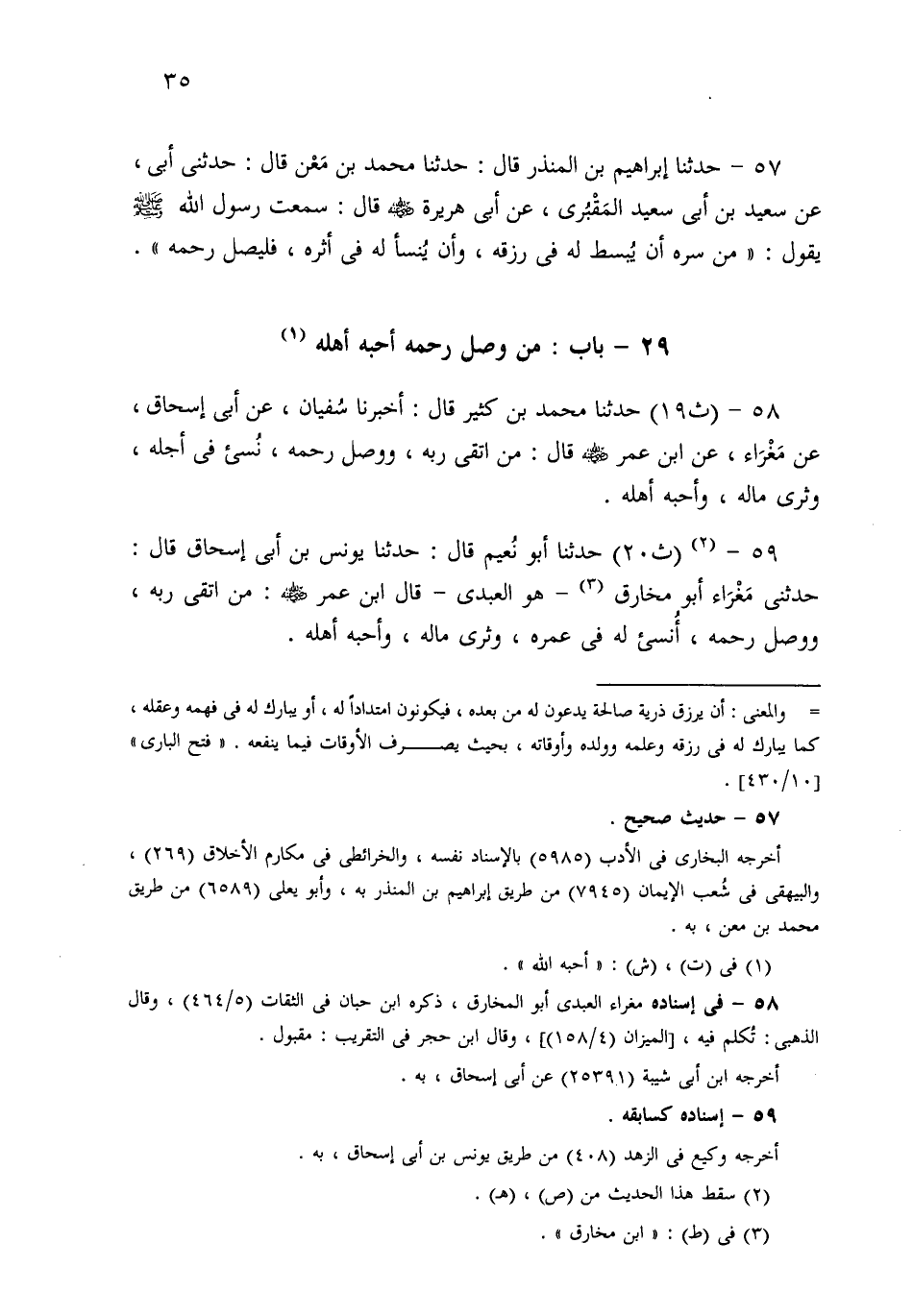 57- حَدثنا إِبْرَاهِيمُ بْنُ الْمُنْذِرِ، قَالَ: حَدثنا مُحَمَّدُ بْنُ مَعْنٍ قَالَ: حَدَّثَنِي أَبِي، عَنْ سَعِيدِ بْنِ أَبِي سَعِيدٍ الْمَقْبُرِيِّ، عَنْ أَبِي هُرَيْرَةَ قَالَ: سَمِعْتُ رَسُولَ اللهِ صَلى الله عَلَيهِ وسَلم يَقُولُ: مَنْ سَرَّهُ أَنْ يُبْسَطَ لَهُ فِي رِزْقِهِ، وَأَنْ يُنْسَأَ لَهُ فِي أَثَرِهِ، فَلْيَصِلْ رَحِمَهُ.