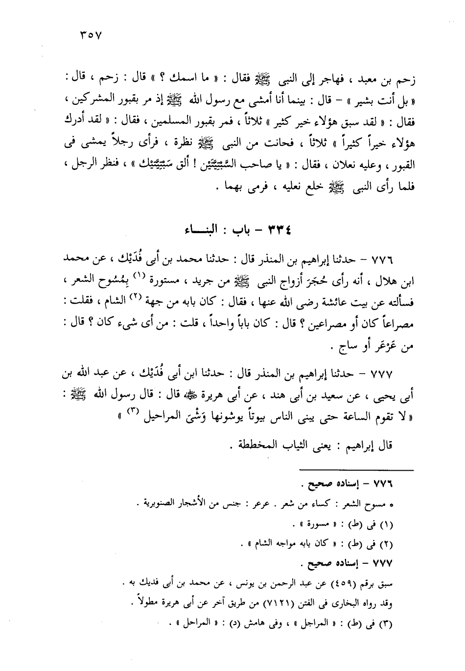 777- حَدثنا إِبْرَاهِيمُ بْنُ الْمُنْذِرِ، قَالَ: حَدثنا ابْنُ أَبِي فُدَيْكٍ، عَنْ عَبْدِ اللهِ بْنِ أَبِي يَحْيَى، عَنْ سَعِيدِ بْنِ أَبِي هِنْدَ، عَنْ أَبِي هُرَيْرَةَ قَالَ: قَالَ رَسُولُ اللهِ صَلى الله عَلَيهِ وسَلم: لاَ تَقُومُ السَّاعَةُ حَتَّى يَبْنِيَ النَّاسُ بُيُوتًا يُوشُونَهَا وَشْيَ الْمَرَاحِيلِ قَالَ إِبْرَاهِيمُ: يَعْنِي الثِّيَابَ الْمُخَطَّطَةَ.