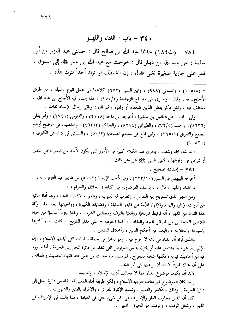 784- حَدثنا عَبْدُ اللهِ بْنُ صَالِحٍ قَالَ: حَدَّثَنِي عَبْدُ الْعَزِيزِ بْنُ أَبِي سَلَمَةَ، عَنْ عَبْدِ اللهِ بْنِ دِينَارٍ قَالَ: خَرَجْتُ مَعَ عَبْدِ اللهِ بْنِ عُمَرَ إِلَى السُّوقِ، فَمَرَّ عَلَى جَارِيَةٍ صَغِيرَةٍ تُغَنِّي، فَقَالَ: إِنَّ الشَّيْطَانَ لَوْ تَرَكَ أَحَدًا لَتَرَكَ هَذِهِ.