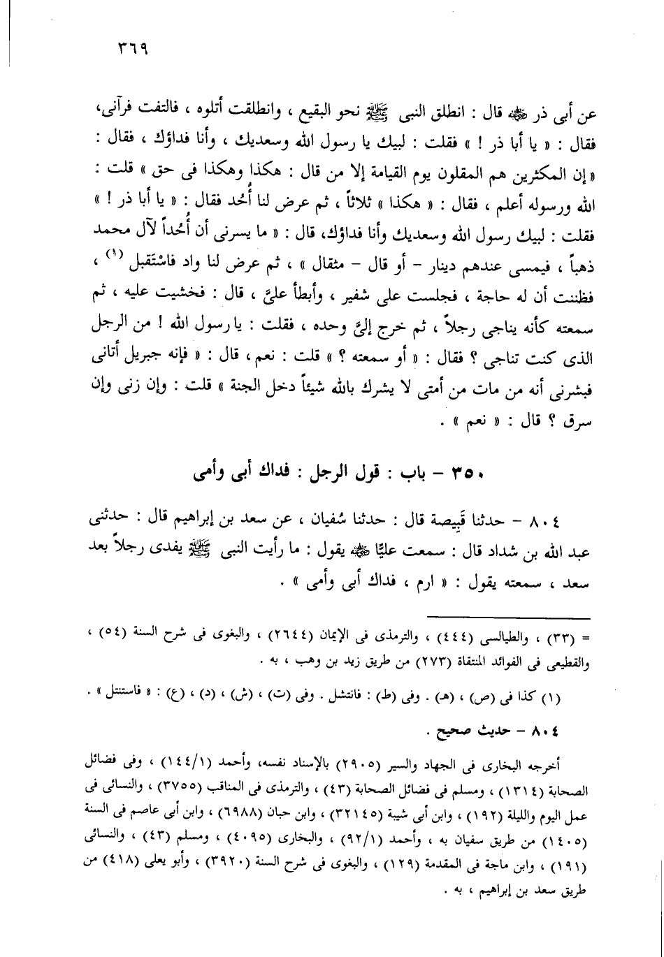 804- حَدثنا قَبِيصَةُ، قَالَ: حَدثنا سُفْيَانُ، عَنْ سَعْدِ بْنِ إِبْرَاهِيمَ قَالَ: حَدَّثَنِي عَبْدُ اللهِ بْنُ شَدَّادٍ قَالَ: سَمِعْتُ عَلِيًّا رَضِيَ اللهُ عَنْهُ يَقُولُ: مَا رَأَيْتُ النَّبِيَّ صَلى الله عَلَيهِ وسَلم يُفَدِّي رَجُلاً بَعْدَ سَعْدٍ، سَمِعْتُهُ يَقُولُ: ارْمِ، فِدَاكَ أَبِي وَأُمِّي