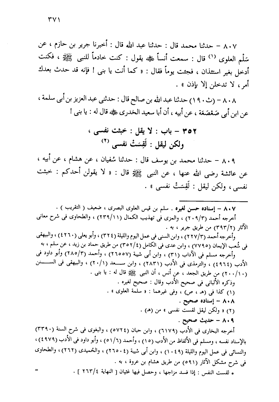807- حَدثنا مُحَمَّدٌ، قَالَ: حَدثنا عَبْدُ اللهِ، قَالَ: أَخْبَرَنَا جَرِيرُ بْنُ حَازِمٍ، عَنْ سَلْمٍ الْعَلَوِيِّ قَالَ: سَمِعْتُ أَنَسًا يَقُولُ: كُنْتُ خَادِمًا لِلنَّبِيِّ صَلى الله عَلَيهِ وسَلم، قَالَ: فَكُنْتُ أَدْخُلُ بِغَيْرِ اسْتِئْذَانٍ، فَجِئْتُ يَوْمًا، فَقَالَ: كَمَا أَنْتَ يَا بُنَيَّ، فَإِنَّهُ قَدْ حَدَثَ بَعْدَكَ أَمْرٌ: لا تَدْخُلَنَّ إِلا بِإِذْنٍ.