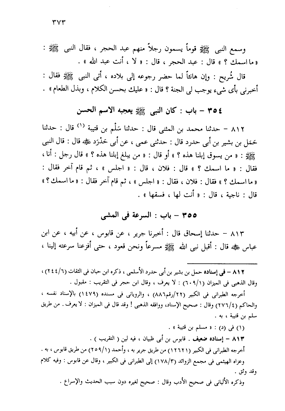 812- حَدثنا مُحَمَّدُ بْنُ الْمُثَنَّى، قَالَ: حَدثنا سَلْمُ بْنُ قُتَيْبَةَ، قَالَ: حَدثنا حَمْلُ بْنُ بَشِيرِ بْنِ أَبِي حَدْرَدٍ قَالَ: حَدَّثَنِي عَمِّي، عَنْ أَبِي حَدْرَدٍ قَالَ: قَالَ النَّبِيُّ صَلى الله عَلَيهِ وسَلم: مَنْ يَسُوقُ إِبِلَنَا هَذِهِ؟ أَوْ قَالَ: مَنْ يُبَلِّغُ إِبِلَنَا هَذِهِ؟ قَالَ رَجُلٌ: أَنَا، فَقَالَ: مَا اسْمُكَ؟ قَالَ: فُلاَنٌ، قَالَ: اجْلِسْ، ثُمَّ قَامَ آخَرُ، فَقَالَ: مَا اسْمُكَ؟ قَالَ: فُلاَنٌ، فقَالَ: اجْلِسْ، ثُمَّ قَامَ آخَرُ، فَقَالَ: مَا اسْمُكَ؟ قَالَ: نَاجِيَةُ، قَالَ: أَنْتَ لَهَا، فَسُقْهَا.