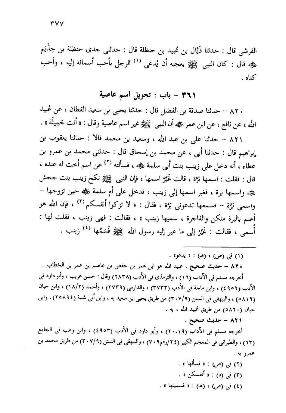 821- حَدثنا عَلِيُّ بْنُ عَبْدِ اللهِ، وَسَعِيدُ بْنُ مُحَمَّدٍ، قَالاَ: حَدثنا يَعْقُوبُ بْنُ إِبْرَاهِيمَ، قَالَ: حَدثنا أَبِي، عَنْ مُحَمَّدِ بْنِ إِسْحَاقَ قَالَ: حَدَّثَنِي مُحَمَّدُ بْنُ عَمْرِو بْنِ عَطَاءٍ، أَنَّهُ دَخَلَ عَلَى زَيْنَبَ بِنْتِ أَبِي سَلَمَةَ، فَسَأَلَتْهُ عَنِ اسْمِ أُخْتٍ لَهُ عِنْدَهُ؟ قَالَ: فَقُلْتُ: اسْمُهَا بَرَّةُ، قَالَتْ: غَيِّرِ اسْمَهَا، فَإِنَّ النَّبِيَّ صَلى الله عَلَيهِ وسَلم نَكَحَ زَيْنَبَ بِنْتَ جَحْشٍ وَاسْمُهَا بَرَّةُ، فَغَيَّرَ اسْمَهَا إِلَى زَيْنَبَ، وَدَخَلَ عَلَى أُمِّ سَلَمَةَ حِينَ تَزَوَّجَهَا، وَاسْمِي بَرَّةُ، فَسَمِعَهَا تَدْعُونِي: بَرَّةَ، فَقَالَ: لاَ تُزَكُّوا أَنْفُسَكُمْ، فَإِنَّ اللهَ هُوَ أَعْلَمُ بِالْبَرَّةِ مِنْكُنَّ وَالْفَاجِرَةِ، سَمِّيهَا زَيْنَبَ، فَقَالَتْ: فَهِيَ زَيْنَبُ، فَقُلْتُ لَهَا: سَمِّي، فَقَالَتْ: غَيِّرْهُ إِلَى مَا غَيَّرَ إِلَيْهِ رَسُولُ اللهِ صَلى الله عَلَيهِ وسَلم، فَسَمِّهَا زَيْنَبَ.