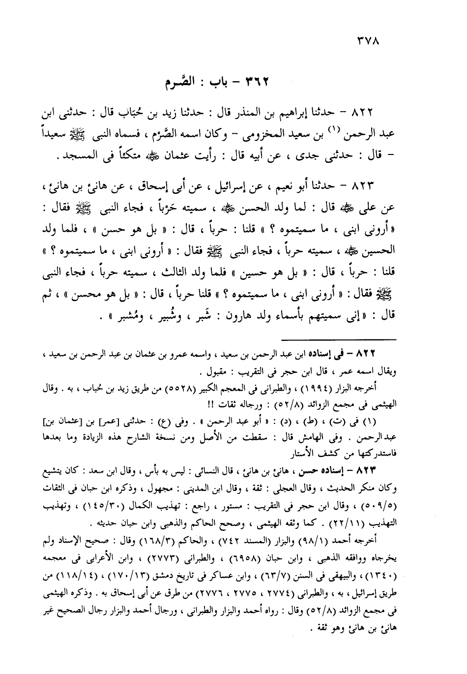 822- حَدثنا إِبْرَاهِيمُ بْنُ الْمُنْذِرِ، قَالَ: حَدثنا زَيْدُ بْنُ حُبَابٍ قَالَ: حَدَّثَنِي عُمَرُ بْنُ عُثْمَانَ بْنِ عَبْدِ الرَّحْمَنِ بْنِ سَعِيدٍ الْمَخْزُومِيُّ، حَدَّثَنِي جَدِّي، عَنْ أَبِيهِ، وَكَانَ اسْمُهُ الصَّرْمَ، فَسَمَّاهُ النَّبِيُّ صَلى الله عَلَيهِ وسَلم سَعِيدًا، قَالَ: رَأَيْتُ عُثْمَانَ رَضِيَ اللهُ عَنْهُ مُتَّكِئًا فِي الْمَسْجِدِ.