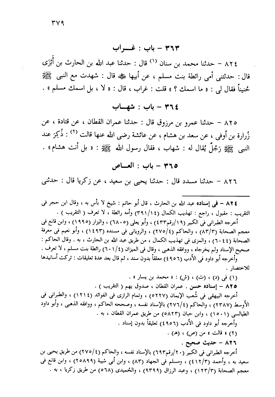 825- حَدثنا عَمْرُو بْنُ مَرْزُوقٍ، قَالَ: حَدثنا عِمْرَانُ الْقَطَّانُ، عَنْ قَتَادَةَ، عَنْ زُرَارَةَ بْنِ أَوْفَى، عَنْ سَعْدِ بْنِ هِشَامٍ، عَنْ عَائِشَةَ رَضِيَ اللهُ عَنْهَا، ذُكِرَ عِنْدَ رَسُولِ اللهِ صَلى الله عَلَيهِ وسَلم رَجُلٌ يُقَالُ لَهُ: شِهَابٌ، فَقَالَ رَسُولُ اللهِ صَلى الله عَلَيهِ وسَلم: بَلْ أَنْتَ هِشَامٌ.