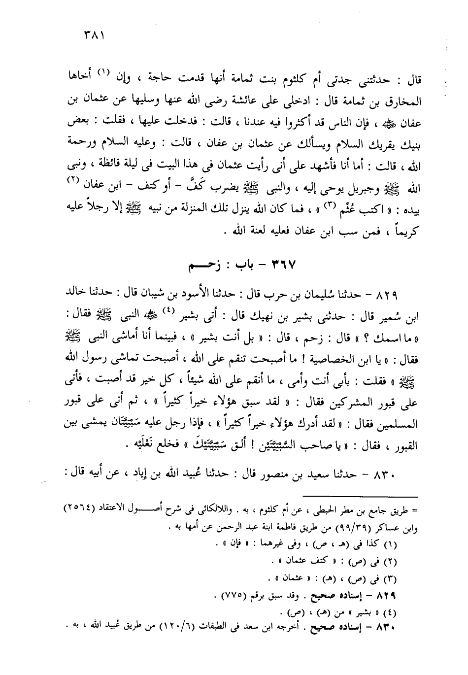 829- حَدثنا سُلَيْمَانُ بْنُ حَرْبٍ، قَالَ: حَدثنا الأَسْوَدُ بْنُ شَيْبَانَ، قَالَ: حَدثنا خَالِدُ بْنُ سُمَيْرٍ (1)، قَالَ: حَدَّثَنِي بَشِيرُ بْنُ نَهِيكٍ، قَالَ: حَدثنا بَشِيرٌ (2)، قَالَ: أَتَى النَّبِيَّ صَلى الله عَلَيهِ وسَلم، فَقَالَ: مَا اسْمُكَ؟ قَالَ: زَحْمٌ، قَالَ: بَلْ أَنْتَ بَشِيرٌ، فَبَيْنَمَا أَنَا أُمَاشِي النَّبِيَّ صَلى الله عَلَيهِ وسَلم، فَقَالَ: يَا ابْنَ الْخَصَاصِيَةِ، مَا أَصْبَحْتَ تَنْقِمُ عَلَى اللهِ؟ أَصْبَحْتَ تُمَاشِي رَسُولَ اللهِ صَلى الله عَلَيهِ وسَلم، قُلْتُ: بِأَبِي وَأُمِّي، مَا أَنْقِمُ عَلَى اللهِ شَيْئًا، كُلَّ خَيْرٍ قَدْ أَصَبْتُ، فَأَتَى عَلَى قُبُورِ الْمُشْرِكِينَ فَقَالَ: لَقَدْ سَبَقَ هَؤُلاَءِ خَيْرًا كَثِيرًا، ثُمَّ أَتَى عَلَى قُبُورِ الْمُسْلِمِينَ فَقَالَ: لَقَدْ أَدْرَكَ هَؤُلاَءِ خَيْرًا كَثِيرًا، فَإِذَا رَجُلٌ عَلَيْهِ سِبْتِيَّتَانِ يَمْشِي بَيْنَ الْقُبُورِ، فَقَالَ: يَا صَاحِبَ السِّبْتِيَّتَيْنِ، أَلْقِ سِبْتِيَّتَكَ، فَخَلَعَ نَعْلَيْهِ.