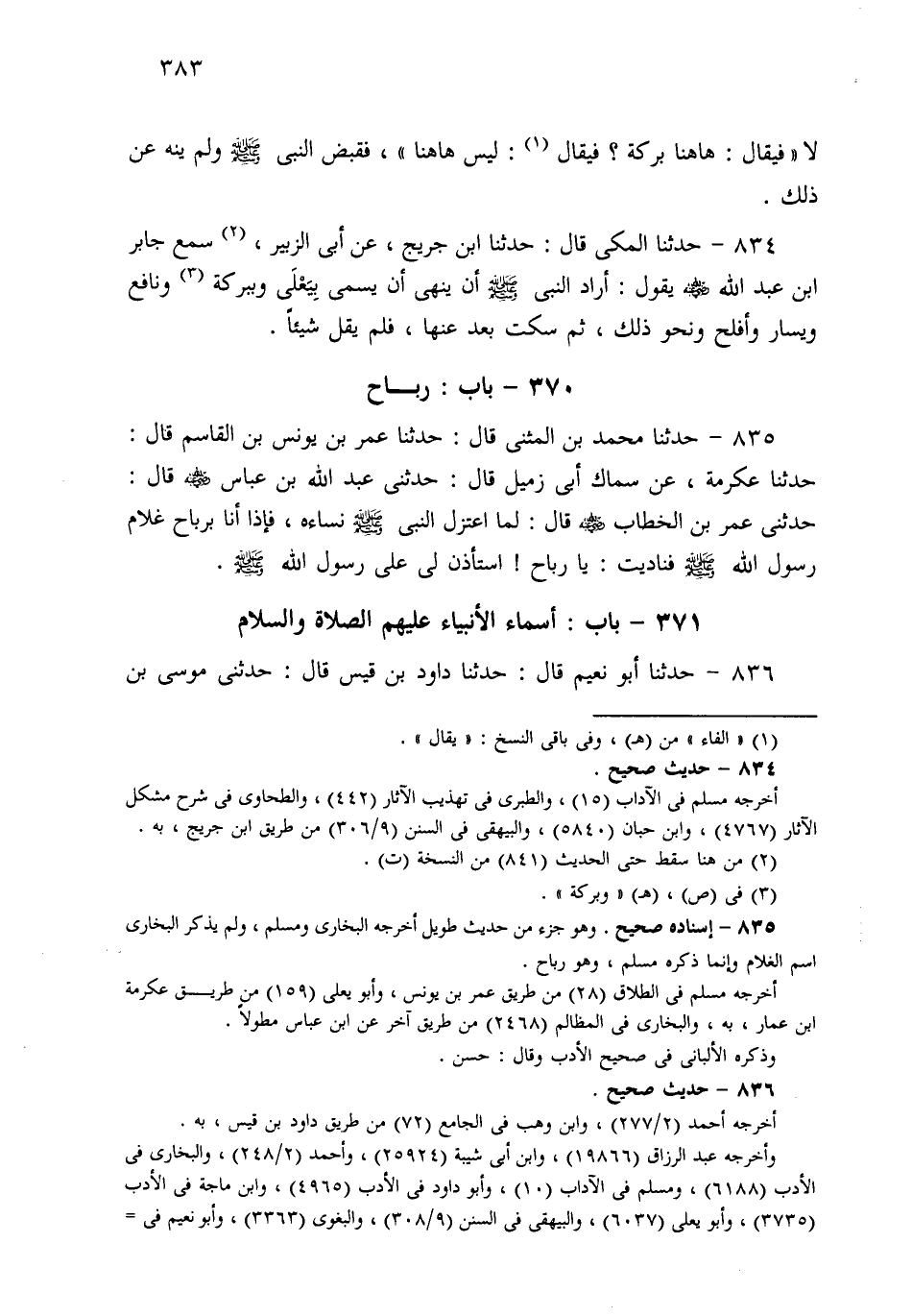 834- حَدثنا الْمَكِّيُّ، قَالَ: حَدثنا ابْنُ جُرَيْجٍ، عَنْ أَبِي الزُّبَيْرِ، سَمِعَ جَابِرَ بْنَ عَبْدِ اللهِ يَقُولُ: أَرَادَ النَّبِيُّ صَلى الله عَلَيهِ وسَلم أَنْ يَنْهَى أَنْ يُسَمَّى بِيَعْلَى، وَبِبَرَكَةَ، وَنَافِعٍ، وَيَسَارٍ، وَأَفْلَحَ، وَنَحْوَ ذَلِكَ، ثُمَّ سَكَتَ بَعْدُ عَنْهَا، فَلَمْ يَقُلْ شَيْئًا.