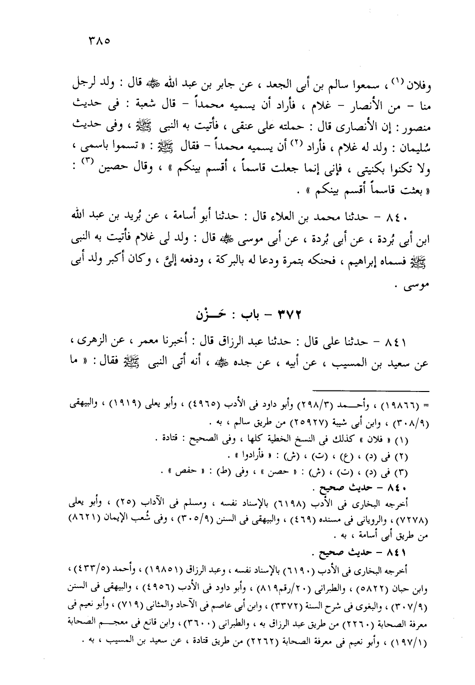 841- حَدثنا عَلِيٌّ، قَالَ: حَدثنا عَبْدُ الرَّزَّاقِ، قَالَ: أَخْبَرَنَا مَعْمَرٌ، عَنِ الزُّهْرِيِّ، عَنْ سَعِيدِ بْنِ الْمُسَيِّبِ، عَنْ أَبِيهِ، عَنْ جَدِّهِ، أَنَّهُ أَتَى النَّبِيَّ صَلى الله عَلَيهِ وسَلم فَقَالَ: مَا اسْمُكَ؟ قَالَ: حَزْنٌ، قَالَ: أَنْتَ سَهْلٌ، قَالَ: لاَ أُغَيِّرُ اسْمًا سَمَّانِيهِ أَبِي، قَالَ ابْنُ الْمُسَيِّبِ: فَمَا زَالَتِ الْحُزُونَةُ فِينَا بَعْدُ.