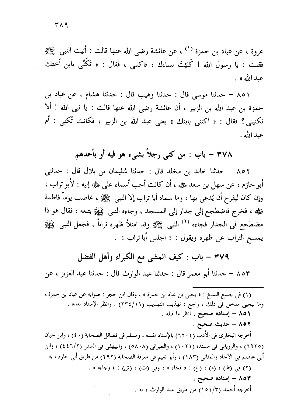 852- حَدثنا خَالِدُ بْنُ مَخْلَدٍ، قَالَ: حَدثنا سُلَيْمَانُ بْنُ بِلاَلٍ قَالَ: حَدَّثَنِي أَبُو حَازِمٍ، عَنْ سَهْلِ بْنِ سَعْدٍ، إِنْ كَانَتْ أَحَبَّ أَسْمَاءِ عَلِيٍّ رَضِيَ اللهُ عَنْهُ إِلَيْهِ لَأَبُو تُرَابٍ، وَإِنْ كَانَ لَيَفْرَحُ أَنْ يُدْعَى بِهَا، وَمَا سَمَّاهُ أَبَا تُرَابٍ إِلاَّ النَّبِيُّ صَلى الله عَلَيهِ وسَلم، غَاضَبَ يَوْمًا فَاطِمَةَ، فَخَرَجَ فَاضْطَجَعَ إِلَى الْجِدَارِ إِلَى الْمَسْجِدِ، وَجَاءَهُ النَّبِيُّ صَلى الله عَلَيهِ وسَلم يَتْبَعُهُ، فَقَالَ: هُوَ ذَا مُضْطَجِعٌ فِي الْجِدَارِ، فَجَاءَ النَّبِيَّ صَلى الله عَلَيهِ وسَلم وَقَدِ امْتَلَأَ ظَهْرُهُ تُرَابًا، فَجَعَلَ النَّبِيُّ صَلى الله عَلَيهِ وسَلم يَمْسَحُ التُّرَابَ عَنْ ظَهْرِهِ وَيَقُولُ: اجْلِسْ أَبَا تُرَابٍ.