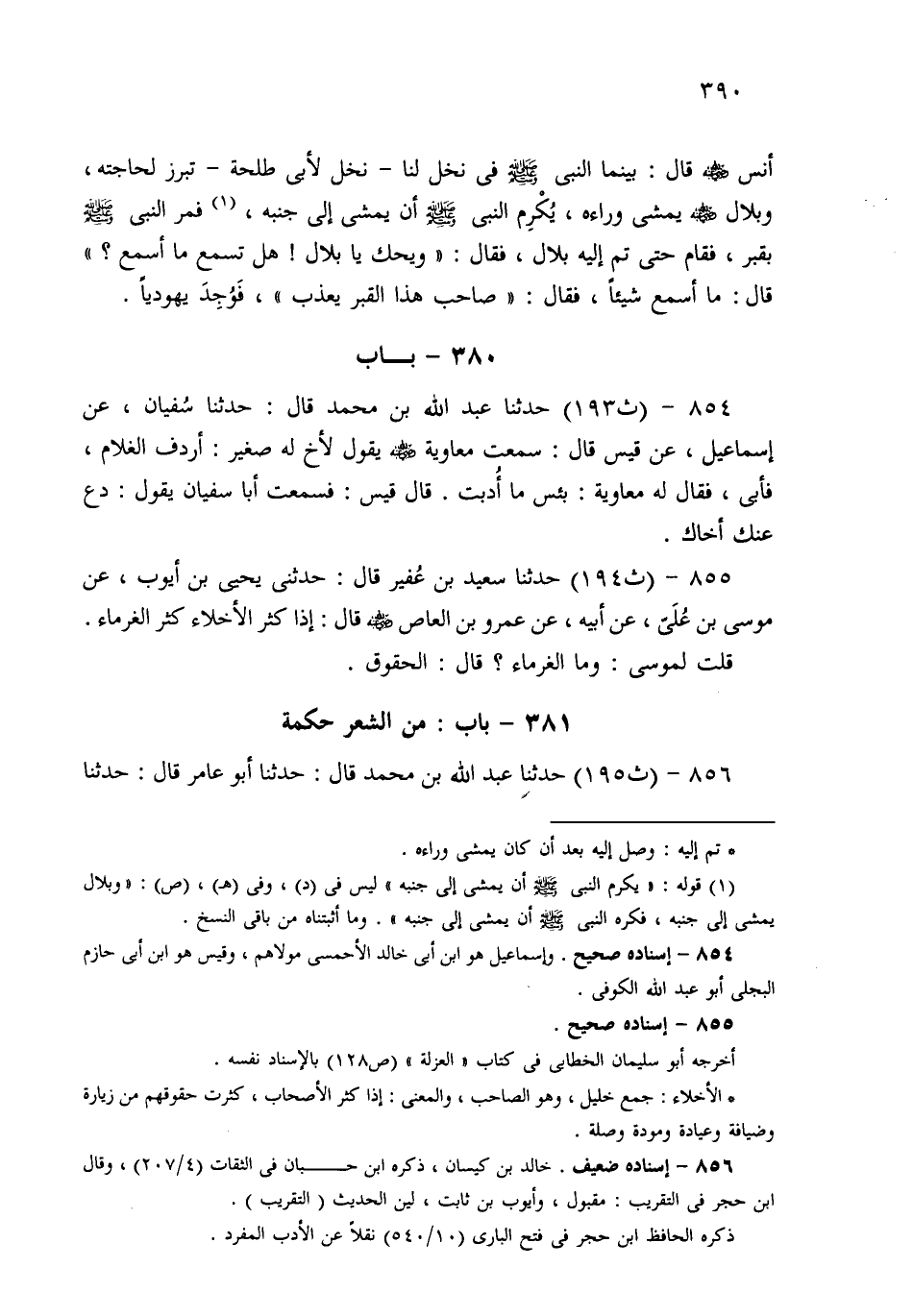 854- حَدثنا عَبْدُ اللهِ بْنُ مُحَمَّدٍ، قَالَ: حَدثنا سُفْيَانُ، عَنْ إِسْمَاعِيلَ، عَنْ قَيْسٍ قَالَ: سَمِعْتُ مُعَاوِيَةَ يَقُولُ لأَخٍ لَهُ صَغِيرٍ: أَرْدِفِ الْغُلاَمَ، فَأَبَى، فَقَالَ لَهُ مُعَاوِيَةُ: بِئْسَ مَا أُدِّبْتَ، قَالَ قَيْسٌ: فَسَمِعْتُ أَبَا سُفْيَانَ يَقُولُ: دَعْ عَنْكَ أَخَاكَ.