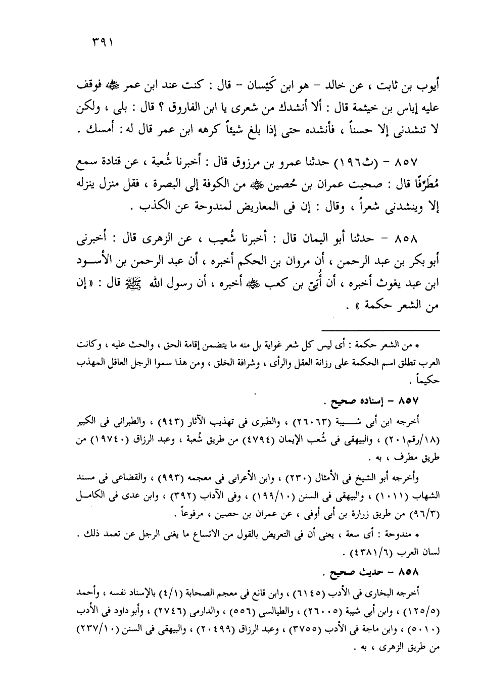 857- حَدثنا عَمْرُو بْنُ مَرْزُوقٍ، قَالَ: أَخْبَرَنَا شُعْبَةُ، عَنْ قَتَادَةَ، سَمِعَ مُطَرِّفًا قَالَ: صَحِبْتُ عِمْرَانَ بْنَ حُصَيْنٍ مِنَ الْكُوفَةِ إِلَى الْبَصْرَةِ، فَقَلَّ مَنْزِلٌ يَنْزِلُهُ إِلاَّ وَهُوَ يُنْشِدُنِي شِعْرًا، وَقَالَ: إِنَّ فِي الْمَعَارِيضِ لَمَنْدُوحَةٌ عَنِ الْكَذِبِ.