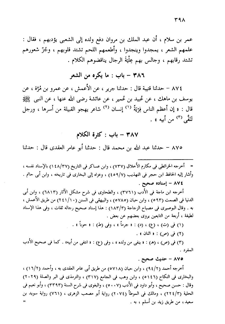875- حَدثنا عَبْدُ اللهِ بْنُ مُحَمَّدٍ، قَالَ: حَدثنا أَبُو عَامِرٍ الْعَقَدِيُّ، قَالَ: حَدثنا زُهَيْرٌ عَنْ زَيْدِ بْنِ أَسْلَمَ قَالَ: سَمِعْتُ ابْنَ عُمَرَ يَقُولُ: قَدِمَ رَجُلاَنِ مِنَ الْمَشْرِقِ خَطِيبَانِ عَلَى عَهْدِ رَسُولِ اللهِ صَلى الله عَلَيهِ وسَلم، فَقَامَا فَتَكَلَّمَا ثُمَّ قَعَدَا، وَقَامَ ثَابِتُ بْنُ قَيْسٍ، خَطِيبُ رَسُولِ اللهِ صَلى الله عَلَيهِ وسَلم فَتَكَلَّمَ، فَعَجِبَ النَّاسُ مِنْ كَلاَمِهِمَا، فَقَامَ رَسُولُ اللهِ صَلى الله عَلَيهِ وسَلم يَخْطُبُ فَقَالَ: يَا أَيُّهَا النَّاسُ، قُولُوا قَوْلَكُمْ، فَإِنَّمَا تَشْقِيقُ الْكَلاَمِ مِنَ الشَّيْطَانِ، ثُمَّ قَالَ رَسُولُ اللهِ صَلى الله عَلَيهِ وسَلم: إِنَّ مِنَ الْبَيَانِ سِحْرًا.