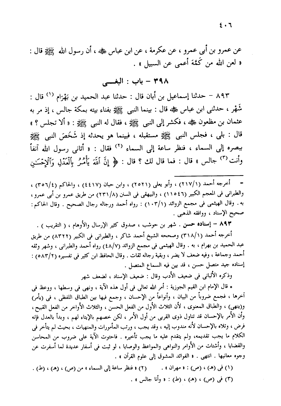 893- حَدثنا إِسْمَاعِيلُ بْنُ أَبَانَ، قَالَ: حَدثنا عَبْدُ الْحَمِيدِ بْنُ بَهْرَامَ، قَالَ: حَدثنا شَهْرٌ قَالَ: حَدَّثَنِي ابْنُ عَبَّاسٍ قَالَ: بَيْنَمَا النَّبِيُّ صَلى الله عَلَيهِ وسَلم بِفِنَاءِ بَيْتِهِ بِمَكَّةَ جَالِسٌ، إِذْ مَرَّ بِهِ عُثْمَانُ بْنُ مَظْعُونٍ، فَكَشَرَ إِلَى النَّبِيِّ صَلى الله عَلَيهِ وسَلم، فَقَالَ لَهُ النَّبِيُّ صَلى الله عَلَيهِ وسَلم: أَلاَ تَجْلِسُ؟ قَالَ: بَلَى، فَجَلَسَ النَّبِيُّ صَلى الله عَلَيهِ وسَلم مُسْتَقْبِلَهُ، فَبَيْنَمَا هُوَ يُحَدِّثُهُ إِذْ شَخَصَ النَّبِيُّ صَلى الله عَلَيهِ وسَلم بَصَرَهُ إِلَى السَّمَاءِ فَقَالَ: أَتَانِي رَسُولُ اللهِ صَلى الله عَلَيهِ وسَلم آنِفًا، وَأَنْتَ جَالِسٌ، قَالَ: فَمَا قَالَ لَكَ؟ قَالَ: {إِنَّ اللهَ يَأْمُرُ بِالْعَدْلِ وَالإِحْسَانِ وَإِيتَاءِ ذِي الْقُرْبَى وَيَنْهَى عَنِ الْفَحْشَاءِ وَالْمُنْكَرِ وَالْبَغْيِ يَعِظُكُمْ لَعَلَّكُمْ تَذَكَّرُونَ} قَالَ عُثْمَانُ: وَذَلِكَ حِينَ اسْتَقَرَّ الإِيمَانُ فِي قَلْبِي وَأَحْبَبْتُ مُحَمَّدًا.