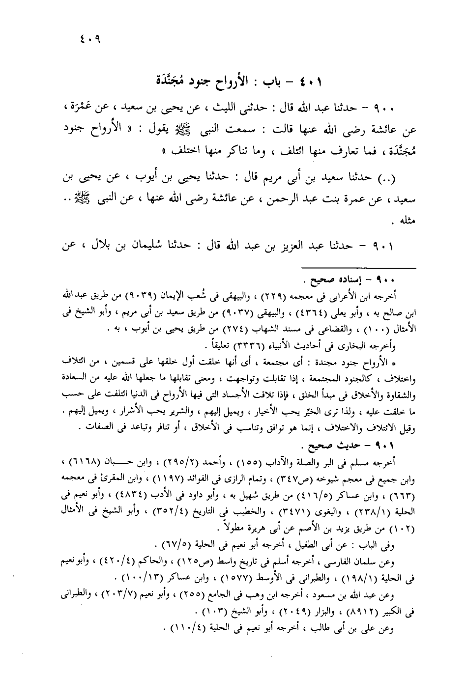 900- حَدثنا عَبْدُ اللهِ قَالَ: حَدَّثَنِي اللَّيْثُ، عَنْ يَحْيَى بْنِ سَعِيدٍ، عَنْ عَمْرَةَ، عَنْ عَائِشَةَ رَضِيَ اللهُ عَنْهَا قَالَتْ: سَمِعْتُ النَّبِيَّ صَلى الله عَلَيهِ وسَلم يَقُولُ: الأَرْوَاحُ جُنُودٌ مُجَنَّدَةٌ، فَمَا تَعَارَفَ مِنْهَا ائْتَلَفَ، وَمَا تَنَاكَرَ مِنْهَا اخْتَلَفَ.