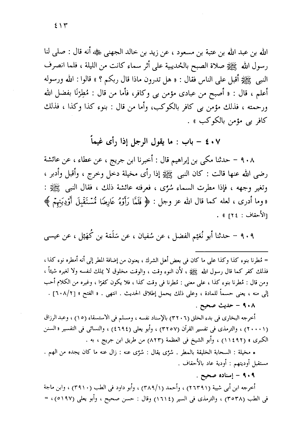 908- حَدثنا مَكِّيُّ بْنُ إِبْرَاهِيمَ، قَالَ: أَخْبَرَنَا ابْنُ جُرَيْجٍ، عَنْ عَطَاءٍ، عَنْ عَائِشَةَ رَضِيَ اللهُ عَنْهَا قَالَتْ: كَانَ النَّبِيُّ صَلى الله عَلَيهِ وسَلم إِذَا رَأَى مَخِيلَةً دَخَلَ وَخَرَجَ، وَأَقْبَلَ وَأَدْبَرَ، وَتَغَيَّرَ وَجْهُهُ، فَإِذَا مَطَرَتِ السَّمَاءُ سُرِّيَ، فَعَرَّفَتْهُ عَائِشَةُ ذَلِكَ، فَقَالَ النَّبِيُّ صَلى الله عَلَيهِ وسَلم: وَمَا أَدْرِي لَعَلَّهُ كَمَا قَالَ اللهُ عَزَّ وَجَلَّ: {فَلَمَّا رَأَوْهُ عَارِضًا مُسْتَقْبِلَ أَوْدِيَتِهِمْ}.