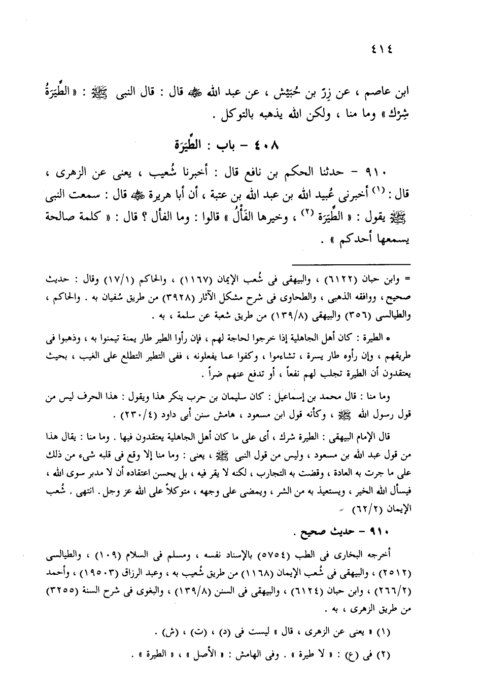 910- حَدثنا الْحَكَمُ بْنُ نَافِعٍ، قَالَ: أَخْبَرَنَا شُعَيْبٌ، يَعْنِي: عَنِ الزُّهْرِيِّ قَالَ: أَخْبَرَنِي عُبَيْدُ اللهِ بْنُ عَبْدِ اللهِ بْنِ عُتْبَةَ، أَنَّ أَبَا هُرَيْرَةَ قَالَ: سَمِعْتُ النَّبِيَّ صَلى الله عَلَيهِ وسَلم يَقُولُ: لاَ طِيَرَةَ، وَخَيْرُهَا الْفَأْلُ، قَالُوا: وَمَا الْفَأْلُ؟ قَالَ: كَلِمَةٌ صَالِحَةٌ يَسْمَعُهَا أَحَدُكُمْ.