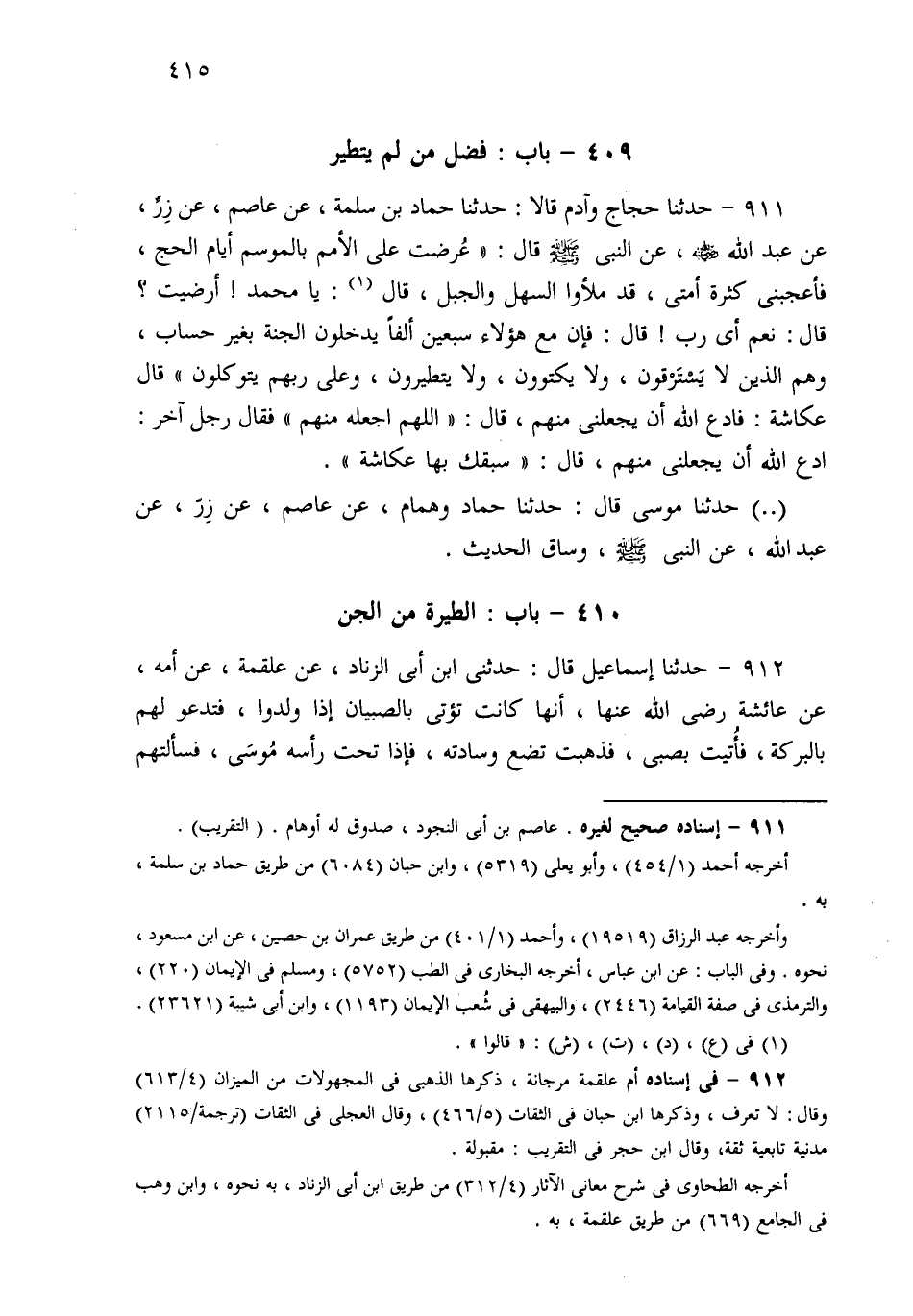 911- حَدثنا حَجَّاجٌ، وَآدَمُ، قَالاَ: حَدثنا حَمَّادُ بْنُ سَلَمَةَ، عَنْ عَاصِمٍ، عَنْ زِرٍّ، عَنْ عَبْدِ اللهِ بْنِ مَسْعُودٍ، عَنِ النَّبِيِّ صَلى الله عَلَيهِ وسَلم قَالَ: عُرِضَتْ عَلَيَّ الأُمَمُ بِالْمَوْسِمِ أَيَّامَ الْحَجِّ، فَأَعْجَبَنِي كَثْرَةُ أُمَّتِي، قَدْ مَلأُوا السَّهْلَ وَالْجَبَلَ، قَالُوا: يَا مُحَمَّدُ، أَرَضِيتَ؟ قَالَ: نَعَمْ، أَيْ رَبِّ، قَالَ: فَإِنَّ مَعَ هَؤُلاَءِ سَبْعِينَ أَلْفًا يَدْخُلُونَ الْجَنَّةَ بِغَيْرِ حِسَابٍ، وَهُمُ الَّذِينَ لاَ يَسْتَرْقُونَ وَلاَ يَكْتَوُونَ، وَلاَ يَتَطَيَّرُونَ، وَعَلَى رَبِّهِمْ يَتَوَكَّلُونَ، قَالَ عُكَّاشَةُ: فَادْعُ اللهَ أَنْ يَجْعَلَنِي مِنْهُمْ، قَالَ: اللَّهُمَّ اجْعَلْهُ مِنْهُمْ، فَقَالَ رَجُلٌ آخَرُ: ادْعُ اللهَ يَجْعَلَنِي مِنْهُمْ، قَالَ: سَبَقَكَ بِهَا عُكَّاشَةُ.