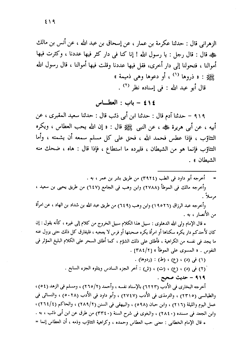 919- حَدثنا آدَمُ، قَالَ: حَدثنا ابْنُ أَبِي ذِئْبٍ، قَالَ: حَدثنا سَعِيدٌ الْمَقْبُرِيُّ، عَنْ أَبِيهِ، عَنْ أَبِي هُرَيْرَةَ، عَنِ النَّبِيِّ صَلى الله عَلَيهِ وسَلم قَالَ: إِنَّ اللهَ يُحِبُّ الْعُطَاسَ، وَيَكْرَهُ التَّثَاؤُبَ، فَإِذَا عَطَسَ فَحَمِدَ اللهَ فَحَقٌّ عَلَى كُلِّ مُسْلِمٍ سَمِعَهُ أَنْ يُشَمِّتَهُ، وَأَمَّا التَّثَاؤُبُ فَإِنَّمَا هُوَ مِنَ الشَّيْطَانِ، فَلْيَرُدَّهُ مَا اسْتَطَاعَ، فَإِذَا قَالَ: هَاهْ، ضَحِكَ مِنْهُ الشَّيْطَانُ.