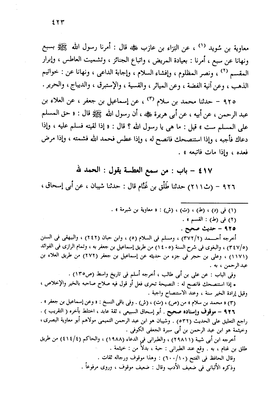 926- حَدثنا طَلْقُ بْنُ غَنَّامٍ، قَالَ: حَدثنا شَيْبَانُ، عَنْ أَبِي إِسْحَاقَ، عَنْ خَيْثَمَةَ، عَنْ عَلِيٍّ رَضِيَ اللهُ عَنْهُ قَالَ: مَنْ قَالَ عِنْدَ عَطْسَةٍ سَمِعَهَا: الْحَمْدُ لِلَّهِ رَبِّ الْعَالَمِينَ عَلَى كُلِّ حَالٍ مَا كَانَ، لَمْ يَجِدْ وَجَعَ الضِّرْسِ وَلا الأُذُنٍ أَبَدًا.