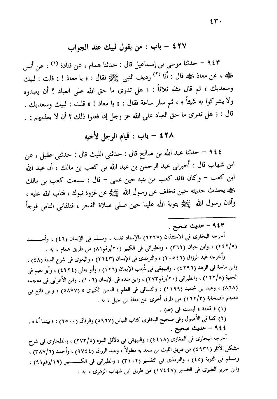 944- حَدثنا عَبْدُ اللهِ بْنُ صَالِحٍ قَالَ: حَدَّثَنِي اللَّيْثُ قَالَ: حَدَّثَنِي عُقَيْلٌ، عَنِ ابْنِ شِهَابٍ قَالَ: أَخْبَرَنِي عَبْدُ الرَّحْمَنِ بْنُ عَبْدِ اللهِ بْنِ كَعْبِ بْنِ مَالِكٍ، أَنَّ عَبْدَ اللهِ بْنَ كَعْبٍ، وَكَانَ قَائِدَ كَعْبٍ مِنْ بَنِيهِ حِينَ عَمِيَ، قَالَ: سَمِعْتُ كَعْبَ بْنَ مَالِكٍ يُحَدِّثُ حَدِيثَهُ حِينَ تَخَلَّفَ عَنْ رَسُولِ اللهِ صَلى الله عَلَيهِ وسَلم عَنْ غَزْوَةِ تَبُوكَ، فَتَابَ اللهُ عَلَيْهِ: وَآذَنَ رَسُولُ اللهِ صَلى الله عَلَيهِ وسَلم بِتَوْبَةِ اللهِ عَلَيْنَا حِينَ صَلَّى صَلاَةَ الْفَجْرَ، فَتَلَقَّانِي النَّاسُ فَوْجًا فَوْجًا، يُهَنُّونِي بِالتَّوْبَةِ يَقُولُونَ: لِتَهْنِكَ تَوْبَةُ اللهِ عَلَيْكَ، حَتَّى دَخَلْتُ الْمَسْجِدَ، فَإِذَا بِرَسُولِ اللهِ صَلى الله عَلَيهِ وسَلم حَوْلَهُ النَّاسُ، فَقَامَ إِلَيَّ طَلْحَةُ بْنُ عُبَيْدِ اللهِ يُهَرْوِلُ، حَتَّى صَافَحَنِي وَهَنَّانِي، وَاللَّهِ مَا قَامَ إِلَيَّ رَجُلٌ مِنَ الْمُهَاجِرِينَ غَيْرُهُ، لا أَنْسَاهَا لِطَلْحَةَ.