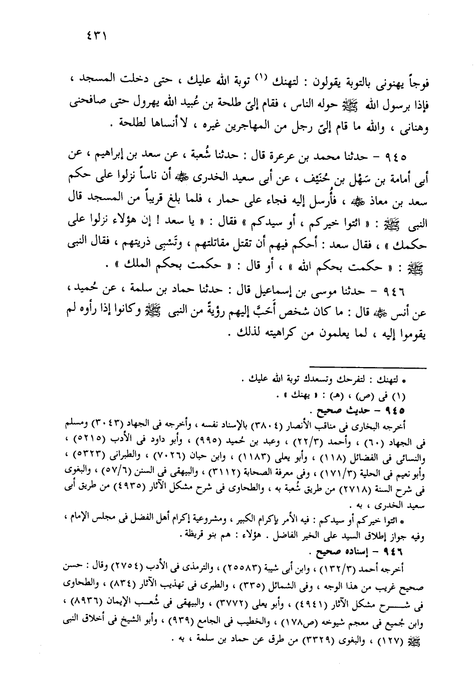 945- حَدثنا مُحَمَّدُ بْنُ عَرْعَرَةَ، قَالَ: حَدثنا شُعْبَةُ، عَنْ سَعْدِ بْنِ إِبْرَاهِيمَ، عَنْ أَبِي أُمَامَةَ بْنِ سَهْلِ بْنِ حُنَيْفٍ، عَنْ أَبِي سَعِيدٍ الْخُدْرِيِّ، أَنَّ نَاسًا نَزَلُوا عَلَى حُكْمِ سَعْدِ بْنِ مُعَاذٍ، فَأَرْسَلَ إِلَيْهِ، فَجَاءَ عَلَى حِمَارٍ، فَلَمَّا بَلَغَ قَرِيبًا مِنَ الْمَسْجِدِ قَالَ النَّبِيُّ صَلى الله عَلَيهِ وسَلم: ائْتُوا خَيْرَكُمْ، أَوْ سَيِّدَكُمْ، فَقَالَ: يَا سَعْدُ إِنَّ هَؤُلاَءِ نَزَلُوا عَلَى حُكْمِكَ، فَقَالَ سَعْدٌ: أَحْكُمُ فِيهِمْ أَنْ تُقْتَلَ مُقَاتِلَتُهُمْ، وَتُسْبَى ذُرِّيَّتُهُمْ، فَقَالَ النَّبِيُّ صَلى الله عَلَيهِ وسَلم: حَكَمْتَ بِحُكْمِ اللهِ، أَوْ قَالَ: حَكَمْتَ بِحُكْمِ الْمَلِكِ.