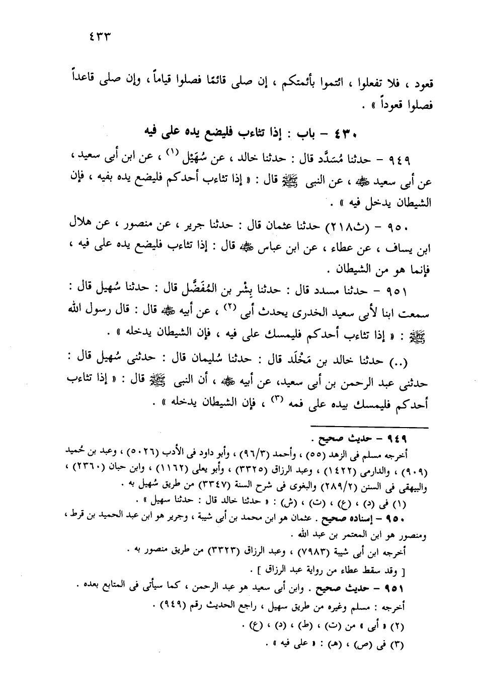 951- حَدثنا مُسَدَّدٌ، قَالَ: حَدثنا بِشْرُ بْنُ الْمُفَضَّلِ، قَالَ: حَدثنا سُهَيْلٌ قَالَ: سَمِعْتُ ابْنًا لأَبِي سَعِيدٍ الْخُدْرِيِّ يُحَدِّثُ أَبِي، عَنْ أَبِيهِ قَالَ: قَالَ رَسُولُ اللهِ صَلى الله عَلَيهِ وسَلم: إِذَا تَثَاءَبَ أَحَدُكُمْ فَلْيُمْسِكْ عَلَى فِيهِ، فَإِنَّ الشَّيْطَانَ يَدْخُلُهُ.