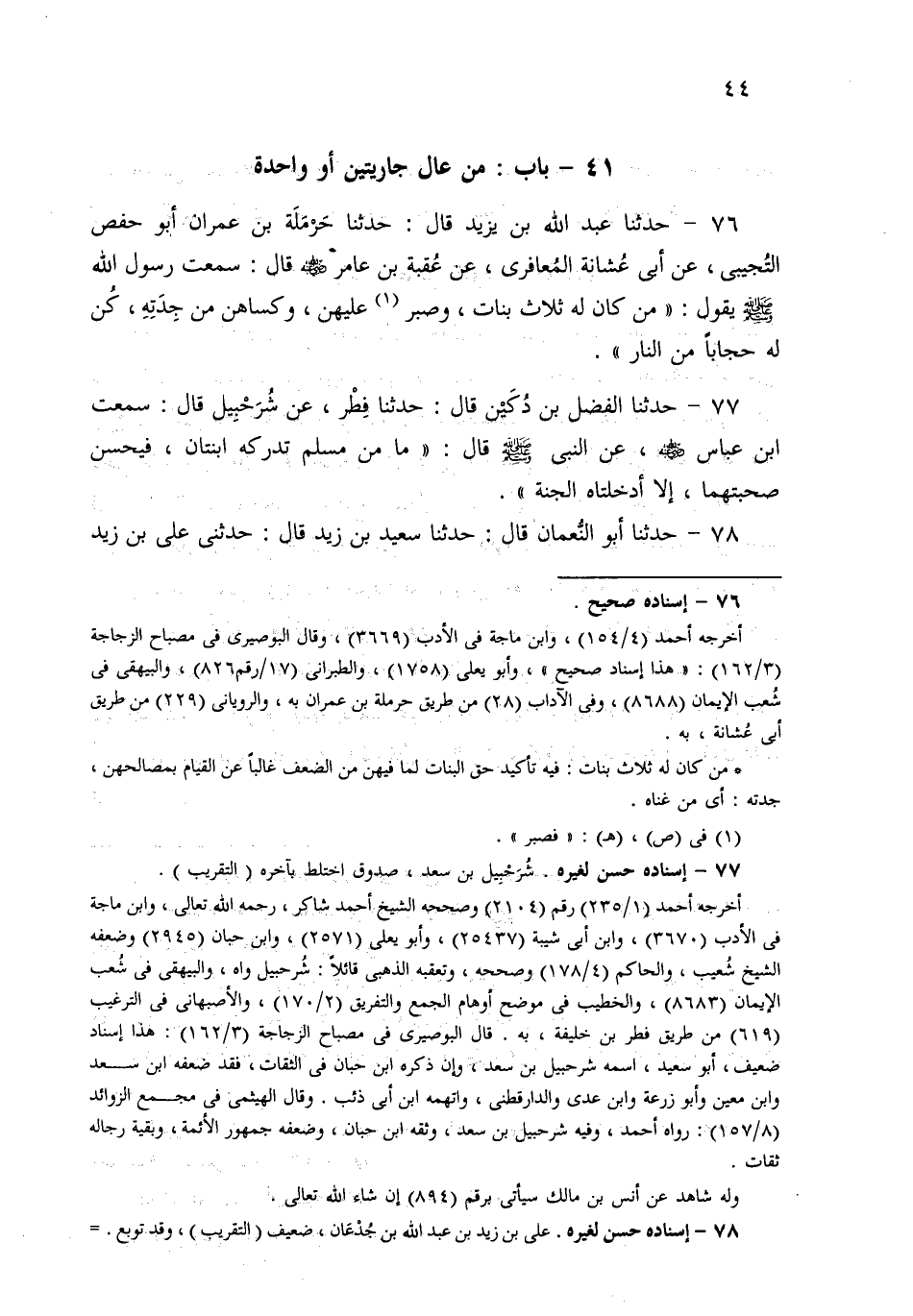 77- حَدثنا الْفَضْلُ بْنُ دُكَيْنٍ، قَالَ: حَدثنا فِطْرٌ، عَنْ شُرَحْبِيلَ قَالَ: سَمِعْتُ ابْنَ عَبَّاسٍ، عَنِ النَّبِيِّ صَلى الله عَلَيهِ وسَلم قَالَ: مَا مِنْ مُسْلِمٍ تُدْرِكُهُ ابْنَتَانِ، فَيُحْسِنُ صُحْبَتَهُمَا، إِلاَّ أَدْخَلَتَاهُ الْجَنَّةَ.