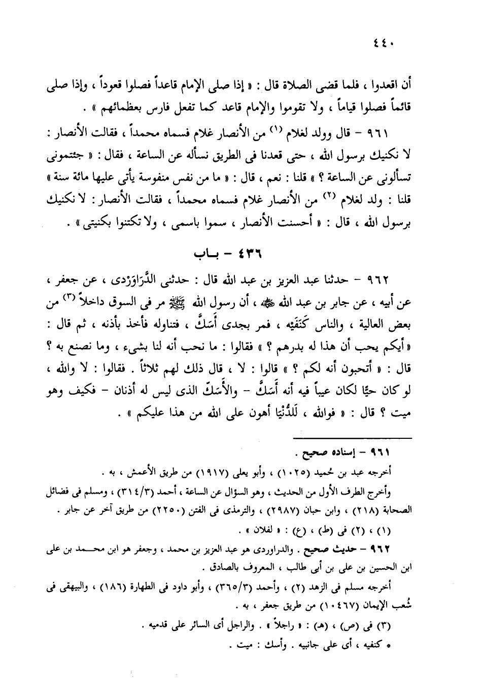 961- قَالَ: وَوُلِدَ لِغُلاَمٍ (1) مِنَ الأَنْصَارِ غُلامٌ، فَسَمَّاهُ مُحَمَّدًا، فَقَالَتِ الأنْصَارُ: لا نُكَنِّيكَ بِرَسُولِ اللهِ، حَتَّى قَعَدْنَا فِي الطَّرِيقِ نَسْأَلُهُ عَنِ السَّاعَةِ، فَقَالَ: جِئْتُمُونِي تَسْأَلُونِي عَنِ السَّاعَةِ؟ قُلْنَا: نَعَمْ، قَالَ: مَا مِنْ نَفْسٍ مَنْفُوسَةٍ، يَأْتِي عَلَيْهَا مِئَةُ سَنَةٍ، قُلْنَا: وُلِدَ لِفُلاَنٍ مِنَ الأَنْصَارِ غُلاَمٌ فَسَمَّاهُ مُحَمَّدًا، فَقَالَتِ الأنْصَارُ: لا نُكَنِّيكَ بِرَسُولِ اللهِ، قَالَ: أَحْسَنَتِ الأَنْصَارُ، سَمُّوا بِاسْمِي، ولا تَكْتَنُوا بِكُنْيَتِي.