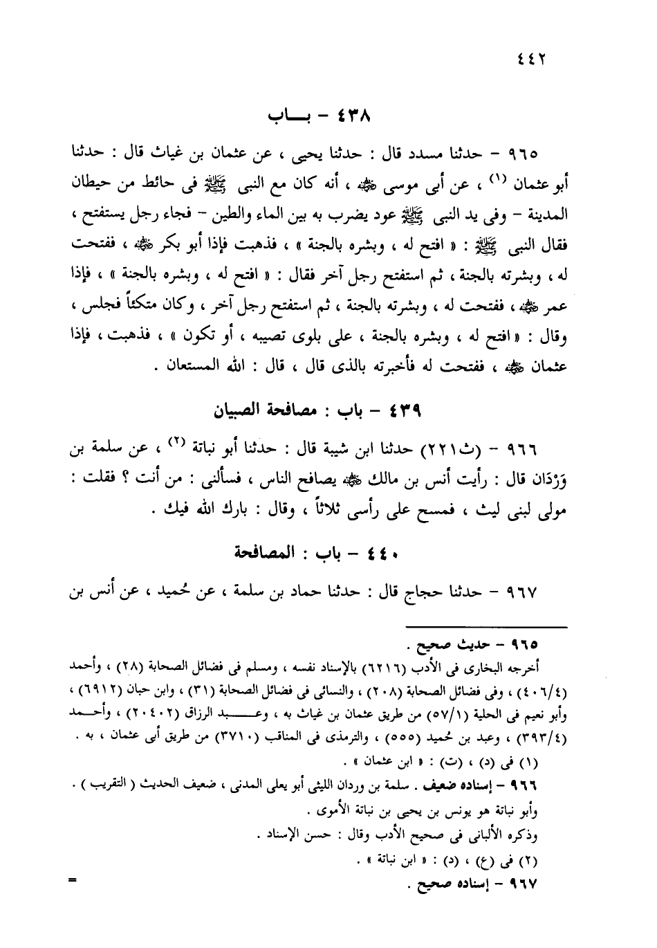 966- حَدثنا ابْنُ شَيْبَةَ، قَالَ: حَدثنا ابْنُ نُبَاتَةَ، عَنْ سَلَمَةَ بْنِ وَرْدَانَ قَالَ: رَأَيْتُ أَنَسَ بْنَ مَالِكٍ يُصَافِحُ النَّاسَ، فَسَأَلَنِي: مَنْ أَنْتَ؟ فَقُلْتُ: مَوْلًى لِبَنِي لَيْثٍ، فَمَسَحَ عَلَى رَأْسِي ثَلاَثًا وَقَالَ: بَارَكَ اللهُ فِيكَ.