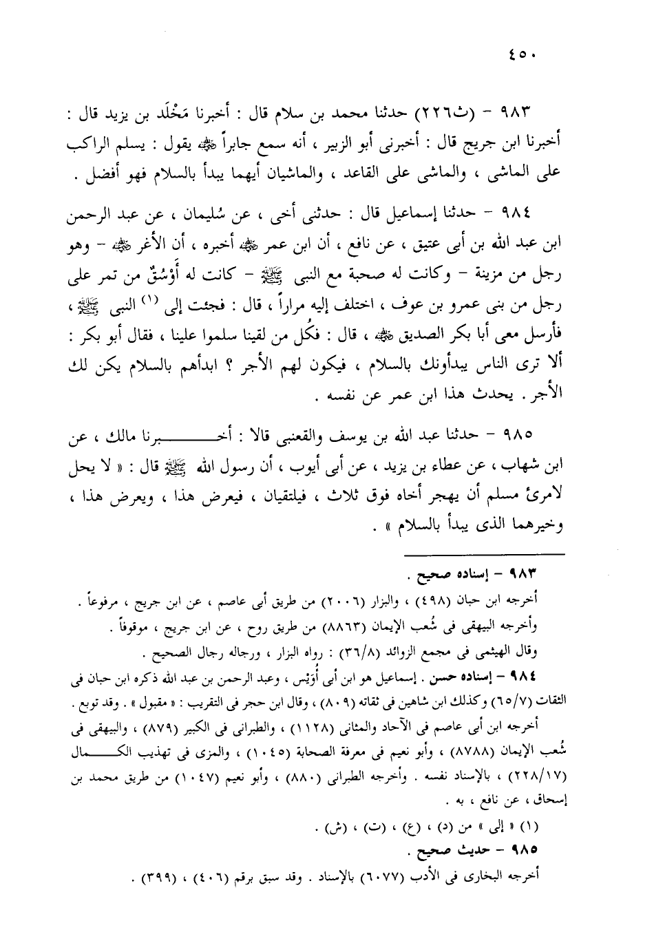 983- حَدثنا مُحَمَّدُ بْنُ سَلاَمٍ، قَالَ: أَخْبَرَنَا مَخْلَدُ بْنُ يَزِيدَ، قَالَ: أَخْبَرَنَا ابْنُ جُرَيْجٍ قَالَ: أَخْبَرَنِي أَبُو الزُّبَيْرِ، أَنَّهُ سَمِعَ جَابِرًا يَقُولُ: يُسَلِّمُ الرَّاكِبُ عَلَى الْمَاشِي، وَالْمَاشِي عَلَى الْقَاعِدِ، وَالْمَاشِيَانِ أَيُّهُمَا يَبْدَأُ بِالسَّلامِ فَهُوَ أَفْضَلُ.