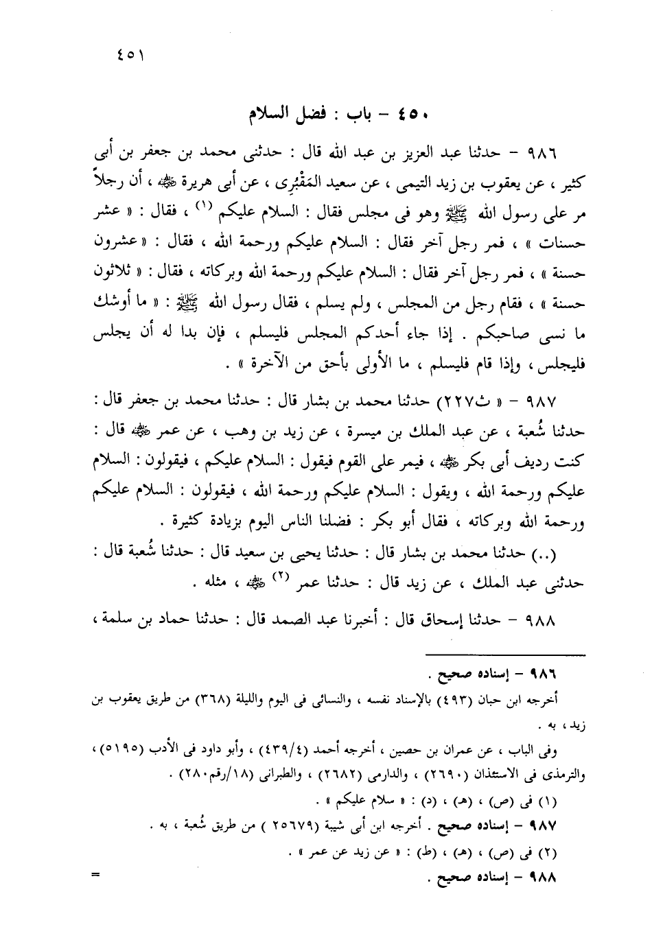 986- حَدثنا عَبْدُ الْعَزِيزِ بْنُ عَبْدِ اللهِ قَالَ: حَدَّثَنِي مُحَمَّدُ بْنُ جَعْفَرِ بْنِ أَبِي كَثِيرٍ، عَنْ يَعْقُوبَ بْنِ زَيْدٍ التَّيْمِيِّ، عَنْ سَعِيدٍ الْمَقْبُرِيِّ، عَنْ أَبِي هُرَيْرَةَ، أَنَّ رَجُلاً مَرَّ عَلَى رَسُولِ اللهِ صَلى الله عَلَيهِ وسَلم وَهُوَ فِي مَجْلِسٍ فَقَالَ: السَّلاَمُ عَلَيْكُمْ، فَقَالَ: عَشْرُ حَسَنَاتٍ، فَمَرَّ رَجُلٌ آخَرُ فَقَالَ: السَّلاَمُ عَلَيْكُمْ وَرَحْمَةُ اللهِ، فَقَالَ: عِشْرُونَ حَسَنَةً، فَمَرَّ رَجُلٌ آخَرُ فَقَالَ: السَّلاَمُ عَلَيْكُمْ وَرَحْمَةُ اللهِ وَبَرَكَاتُهُ، فَقَالَ: ثَلاَثُونَ حَسَنَةً، فَقَامَ رَجُلٌ مِنَ الْمَجْلِسِ وَلَمْ يُسَلِّمْ، فَقَالَ رَسُولُ اللهِ صَلى الله عَلَيهِ وسَلم: مَا أَوْشَكَ مَا نَسِيَ صَاحِبُكُمْ، إِذَا جَاءَ أَحَدُكُمُ الْمَجْلِسَ فَلْيُسَلِّمْ، فَإِنْ بَدَا لَهُ أَنْ يَجْلِسَ فَلْيَجْلِسْ، وَإِذَا قَامَ فَلْيُسَلِّمْ، مَا الأُولَى بِأَحَقَّ مِنَ الآخِرَةِ.