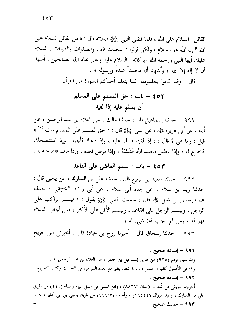 992- حَدثنا سَعِيدُ بْنُ الرَّبِيعِ، قَالَ: حَدثنا عَلِيُّ بْنُ الْمُبَارَكِ، عَنْ يَحْيَى، قَالَ: حَدثنا زَيْدُ بْنُ سَلاَّمٍ، عَنْ جَدِّهِ أَبِي سَلاَّمٍ، عَنْ أَبِي رَاشِدٍ الْحُبْرَانِيِّ، عَنْ عَبْدِ الرَّحْمَنِ بْنِ شِبْلٍ قَالَ: سَمِعْتُ النَّبِيَّ صَلى الله عَلَيهِ وسَلم يَقُولُ: لِيُسَلِّمِ الرَّاكِبُ عَلَى الرَّاجِلِ، وَلْيُسَلِّمِ الرَّاجِلُ عَلَى الْقَاعِدِ، وَلْيُسَلِّمِ الأَقَلُّ عَلَى الأَكْثَرِ، فَمَنْ أَجَابَ السَّلاَمَ فَهُوَ لَهُ، وَمَنْ لَمْ يُجِبْ فَلا شَيْءَ لَهُ.