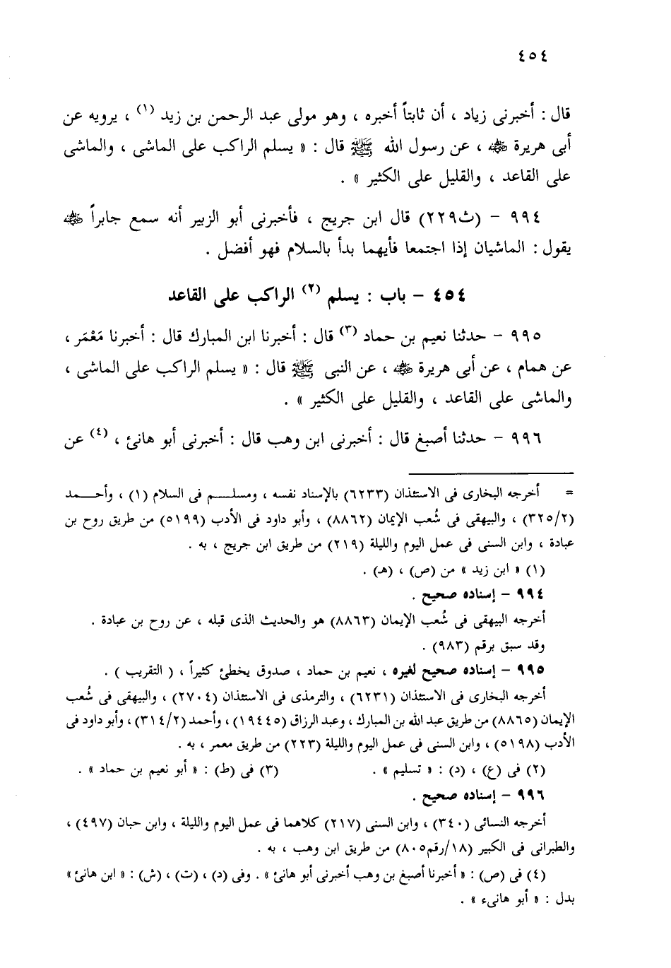 995- حَدثنا نُعَيْمُ بْنُ حَمَّادٍ، قَالَ: أَخْبَرَنَا ابْنُ الْمُبَارَكِ، قَالَ: أَخْبَرَنَا مَعْمَرٌ، عَنْ هَمَّامٍ، عَنْ أَبِي هُرَيْرَةَ، عَنِ النَّبِيِّ صَلى الله عَلَيهِ وسَلم قَالَ: يُسَلِّمُ الرَّاكِبُ عَلَى الْمَاشِي، وَالْمَاشِي عَلَى الْقَاعِدِ، وَالْقَلِيلُ عَلَى الْكَثِيرِ.