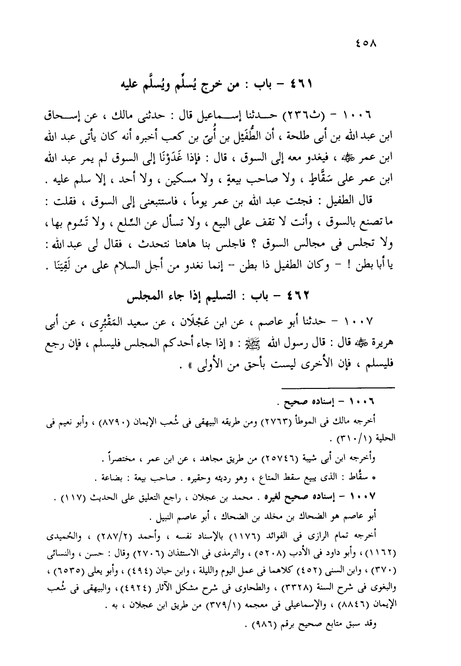 1006- حَدثنا إِسْمَاعِيلُ قَالَ: حَدَّثَنِي مَالِكٌ، عَنْ إِسْحَاقَ بْنِ عَبْدِ اللهِ بْنِ أَبِي طَلْحَةَ، أَنَّ الطُّفَيْلَ بْنَ أُبَيِّ بْنِ كَعْبٍ أَخْبَرَهُ، أَنَّهُ كَانَ يَأْتِي عَبْدَ اللهِ بْنَ عُمَرَ فَيَغْدُو مَعَهُ إِلَى السُّوقِ، قَالَ: فَإِذَا غَدَوْنَا إِلَى السُّوقِ لَمْ يَمُرَّ عَبْدُ اللهِ بْنُ عُمَرَ عَلَى سَقَّاطٍ، وَلاَ صَاحِبِ بَيْعَةٍ، وَلاَ مِسْكِينٍ، وَلاَ أَحَدٍ إِلاَّ يُسَلِّمُ عَلَيْهِ.