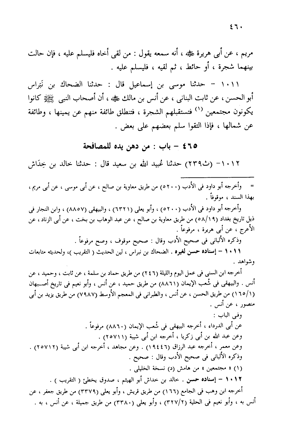 1012- حَدثنا عُبَيْدُ اللهِ بْنُ سَعِيدٍ، قَالَ: حَدثنا خَالِدُ بْنُ خِدَاشٍ، قَالَ: حَدثنا عَبْدُ اللهِ بْنُ وَهْبٍ الْمِصْرِيُّ، عَنْ قُرَيْشٍ الْبَصْرِيِّ هُوَ ابْنُ حَيَّانَ، عَنْ ثَابِتٍ الْبُنَانِيِّ، أَنَّ أَنَسًا كَانَ إِذَا أَصْبَحَ ادَّهَنَ يَدَهُ بِدُهْنٍ طَيِّبٍ لِمُصَافَحَةِ إِخْوَانِهِ.