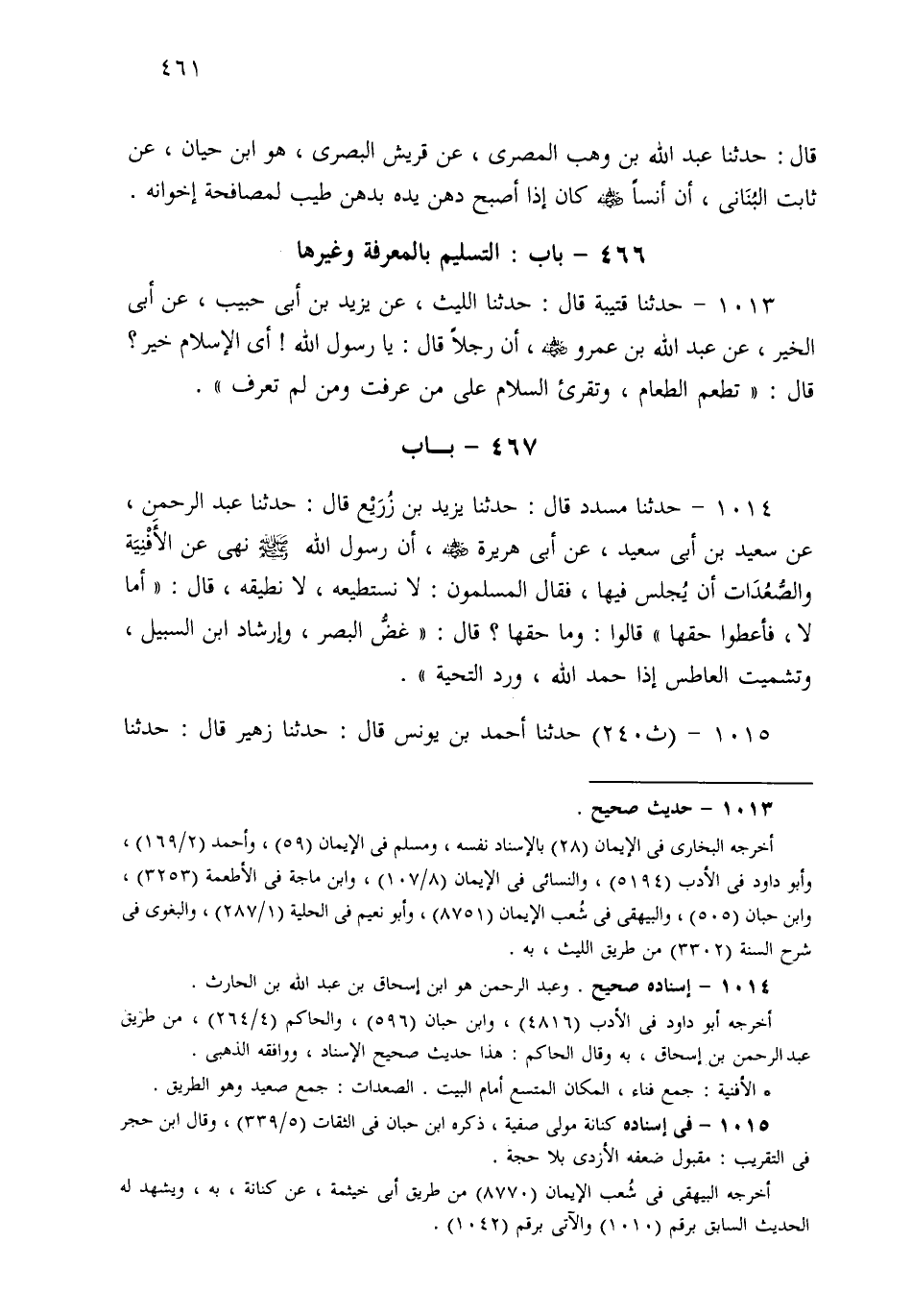 1013- حَدثنا قُتَيْبَةُ، قَالَ: حَدثنا اللَّيْثُ، عَنْ يَزِيدَ بْنِ أَبِي حَبِيبٍ، عَنْ أَبِي الْخَيْرِ، عَنْ عَبْدِ اللهِ بْنِ عَمْرٍو، أَنَّ رَجُلاً قَالَ: يَا رَسُولَ اللهِ، أَيُّ الإِسْلاَمِ خَيْرٌ؟ قَالَ: تُطْعِمُ الطَّعَامَ، وَتُقْرِئُ السَّلاَمَ عَلَى مَنْ عَرَفْتَ وَمَنْ لَمْ تَعْرِفْ.