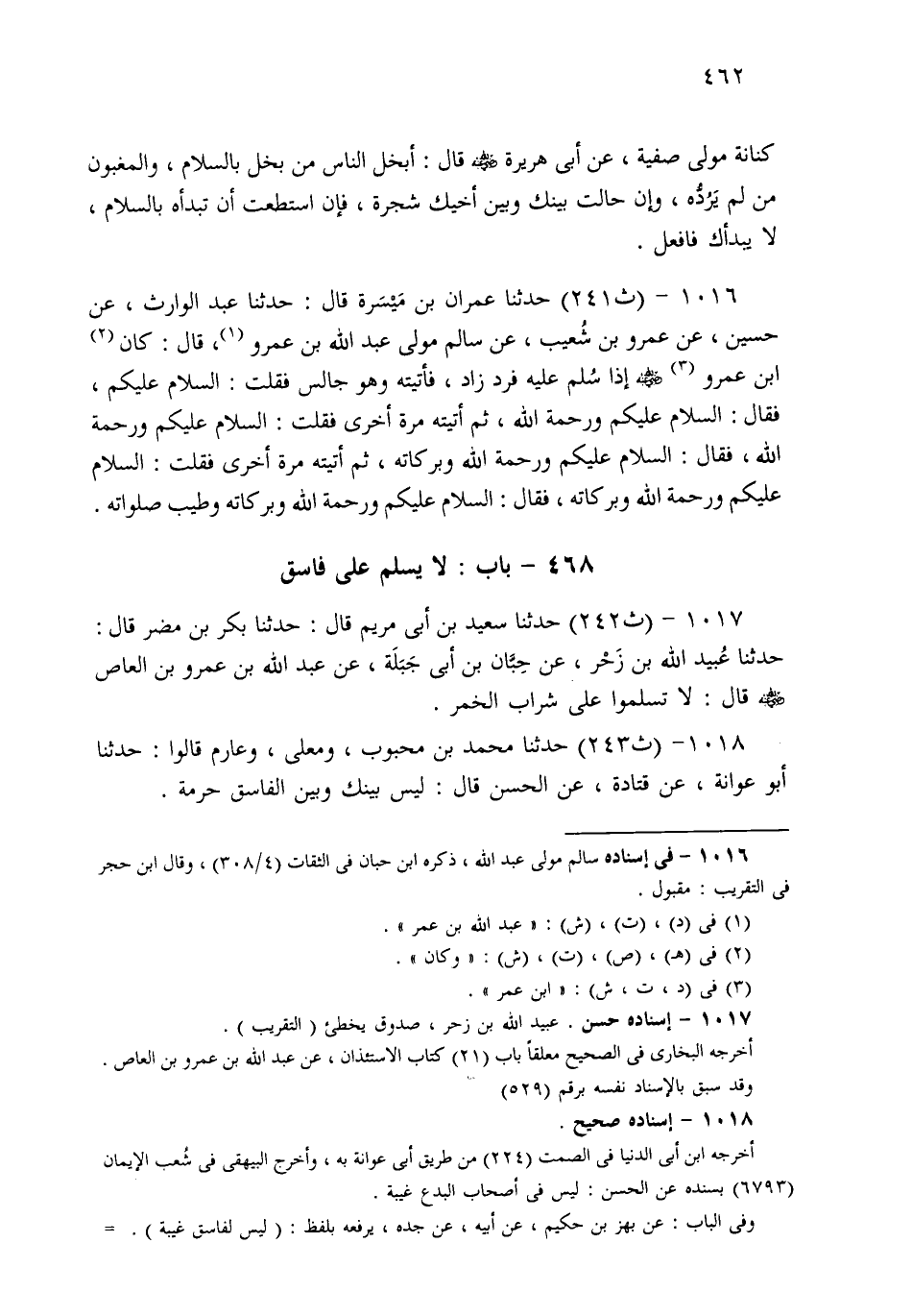 1017- حَدثنا سَعِيدُ بْنُ أَبِي مَرْيَمَ، قَالَ: حَدثنا بَكْرُ بْنُ مُضَرَ، قَالَ: حَدثنا عُبَيْدُ اللهِ بْنُ زَحْرٍ، عَنْ حِبَّانَ بْنِ أَبِي جَبَلَةَ، عَنْ عَبْدِ اللهِ بْنِ عَمْرِو بْنِ الْعَاصِ قَالَ: لاَ تُسَلِّمُوا عَلَى شُرَّابِ الْخَمْرِ.