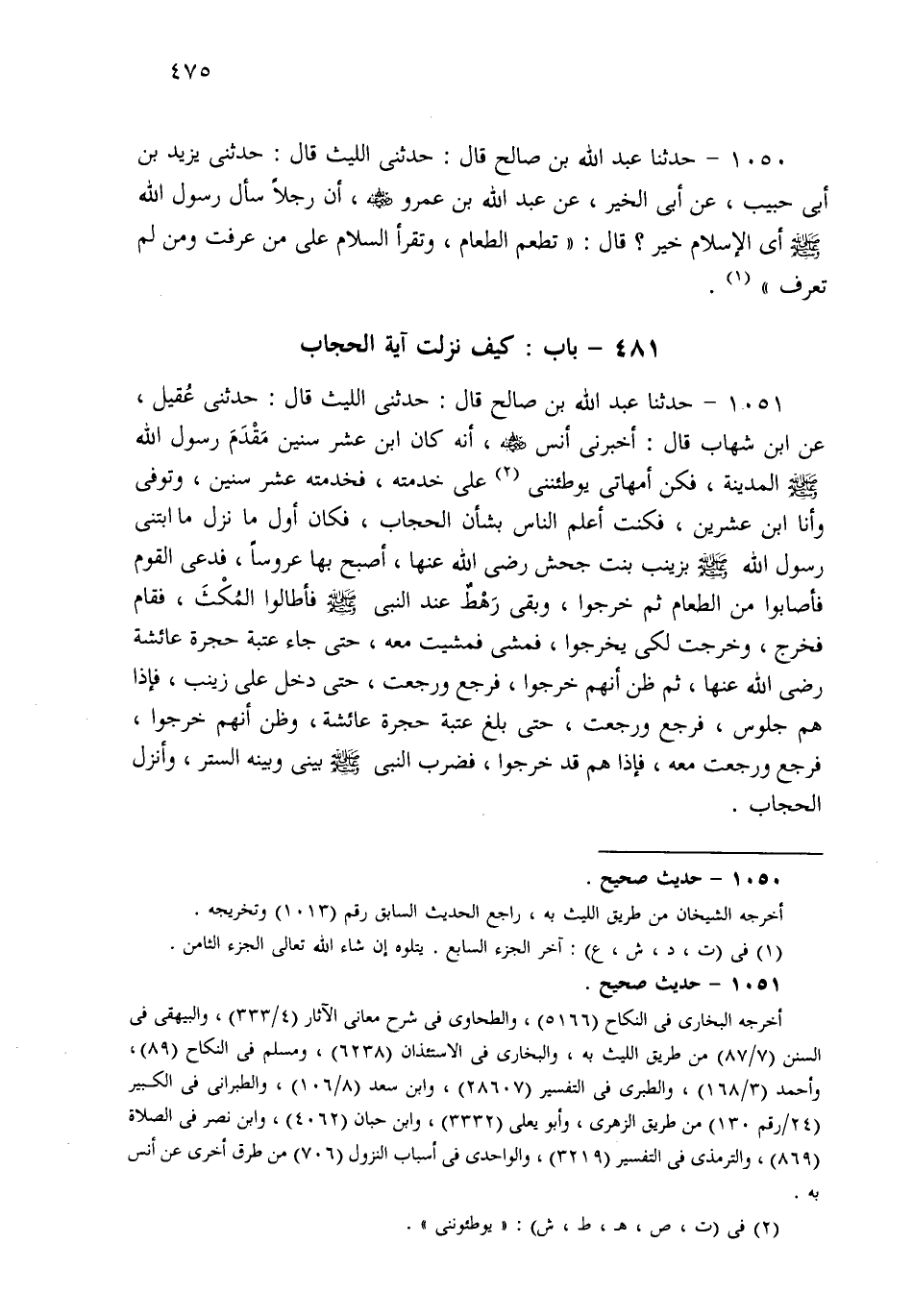1051- حَدثنا عَبْدُ اللهِ بْنُ صَالِحٍ قَالَ: حَدَّثَنِي اللَّيْثُ قَالَ: حَدَّثَنِي عُقَيْلٌ، عَنِ ابْنِ شِهَابٍ قَالَ: أَخْبَرَنِي أَنَسٌ، أَنَّهُ كَانَ ابْنَ عَشْرِ سِنِينَ مَقْدَمَ رَسُولِ اللهِ صَلى الله عَلَيهِ وسَلم الْمَدِينَةَ، فَكُنَّ أُمَّهَاتِي يُوَطِّوَنَّنِي عَلَى خِدْمَتِهِ، فَخَدَمْتُهُ عَشْرَ سِنِينَ، وَتُوُفِّيَ وَأَنَا ابْنُ عِشْرِينَ، فَكُنْتُ أَعْلَمَ النَّاسِ بِشَأْنِ الْحِجَابِ، فَكَانَ أَوَّلُ مَا نَزَلَ مَا ابْتَنَى رَسُولُ اللهِ صَلى الله عَلَيهِ وسَلم بِزَيْنَبَ بِنْتِ جَحْشٍ، أَصْبَحَ بِهَا عَرُوسًا، فَدَعَى الْقَوْمَ فَأَصَابُوا مِنَ الطَّعَامِ، ثُمَّ خَرَجُوا، وَبَقِيَ رَهْطٌ عِنْدَ النَّبِيِّ صَلى الله عَلَيهِ وسَلم، فَأَطَالُوا الْمُكْثَ، فَقَامَ فَخَرَجَ وَخَرَجْتُ لِكَيْ يَخْرُجُوا، فَمَشَى فَمَشَيْتُ مَعَهُ، حَتَّى جَاءَ عَتَبَةَ حُجْرَةِ عَائِشَةَ، ثُمَّ ظَنَّ أَنَّهُمْ خَرَجُوا، فَرَجَعَ وَرَجَعْتُ مَعَهُ حَتَّى دَخَلَ عَلَى زَيْنَبَ، فَإِذَا هُمْ جُلُوسٌ، فَرَجَعَ وَرَجَعْتُ حَتَّى بَلَغَ عَتَبَةَ حُجْرَةِ عَائِشَةَ، وَظَنَّ أَنَّهُمْ خَرَجُوا، فَرَجَعَ وَرَجَعْتُ مَعَهُ، فَإِذَا هُمْ قَدْ خَرَجُوا، فَضَرَبَ النَّبِيُّ صَلى الله عَلَيهِ وسَلم بَيْنِي وَبَيْنَهُ السِّتْرَ، وَأَنْزَلَ الْحِجَابَ.
