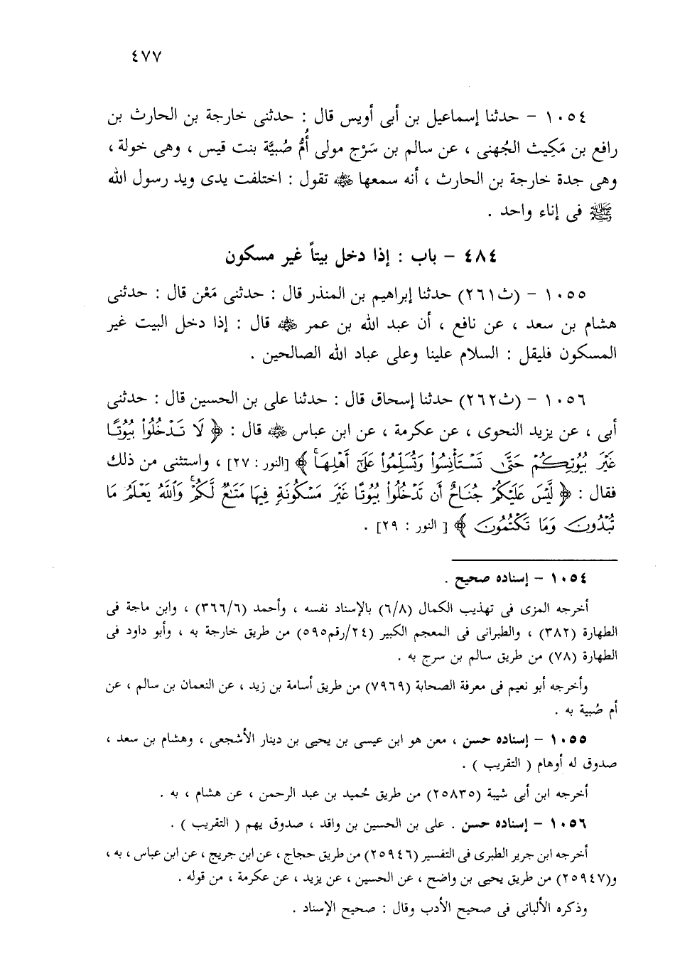 1055- حَدثنا إِبْرَاهِيمُ بْنُ الْمُنْذِرِ قَالَ: حَدَّثَنِي مَعْنٌ قَالَ: حَدَّثَنِي هِشَامُ بْنُ سَعْدٍ، عَنْ نَافِعٍ، أَنَّ عَبْدَ اللهِ بْنَ عُمَرَ قَالَ: إِذَا دَخَلَ الْبَيْتَ غَيْرَ الْمَسْكُونِ فَلْيَقُلِ: السَّلاَمُ عَلَيْنَا وَعَلَى عِبَادِ اللهِ الصَّالِحِينَ.